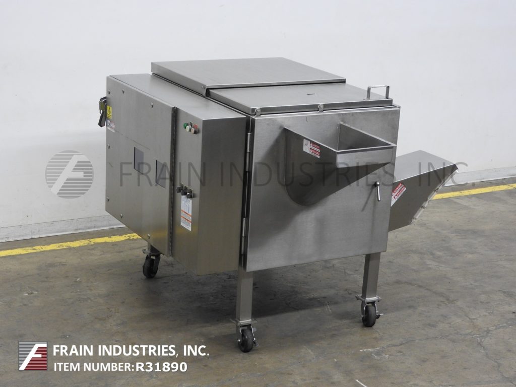 Urschel Model M, stainless steel, belt fed, dicer, shredder and strip cutter designed for meat products and capable of production rates from 500 to 4,500 lbs per hour – depending on materials and application. Capable of strip cuts from 3/16" to 3" and cross cuts from 1/8" to 4". Equipped with 32" x 9" load area on feed belt and adjustable feed roll allowing for positive product feed at all thicknesses from 3/8" to 1". Mounted on a stainless steel frame. Change parts required to accommodate different configurations and size ranges.