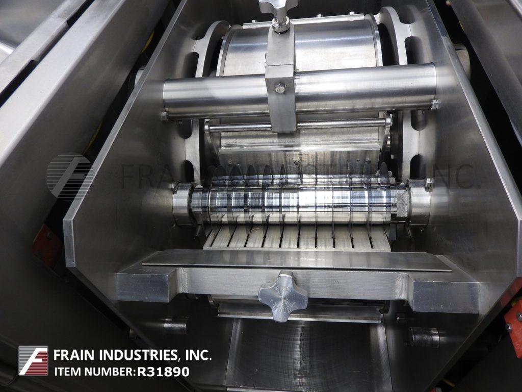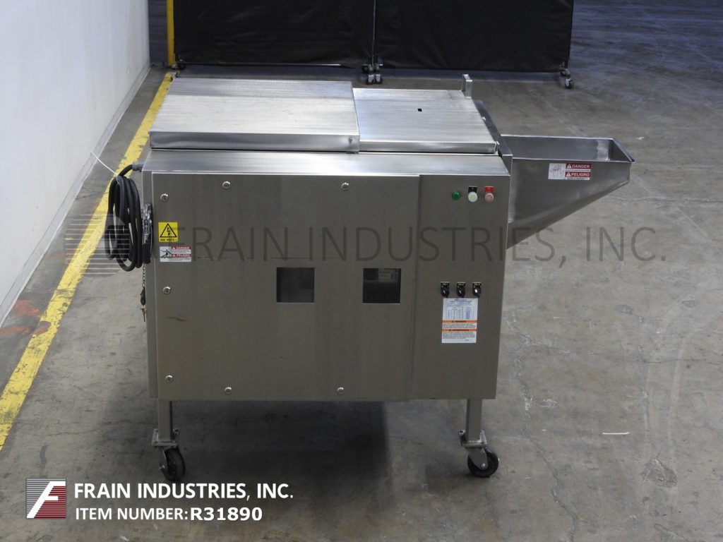 FAM Model ILC, all stainless steel construction, slices, strip cuts and dices up to 2,205 pounds of product per hour – depending on materials and application. Equipped with 18" x 17" stainless steel product feed hopper, 11" OD product port to processing chamber, and has combination of 3 cutting tools for flexibility in choice of cut-sizes and shapes with little juice loss, no cellular damage for smooth cut surfaces, all contributing to extended shelf-life. Cut sizes, Flat slices: 1,60 mm to 28 mm. crinkle slices 3,20 mm to 25 mm. Strip cuttting: circular knife cuts: 2,50 mm to 76 mm, crosscut knife cuts: 4 mm to 64 mm. Dices: flat cut: 3 mm to 64 mm, crinkle cut: 7,10 mm to 16 mm and all knives are changeable for high-capacity production of various applications such as vegetables, fruits and potato processing with proper change parts. Control panel has start, stop and e-stop controls with readout. Mounted on stainless steel frame with interlock safety switch and casters.