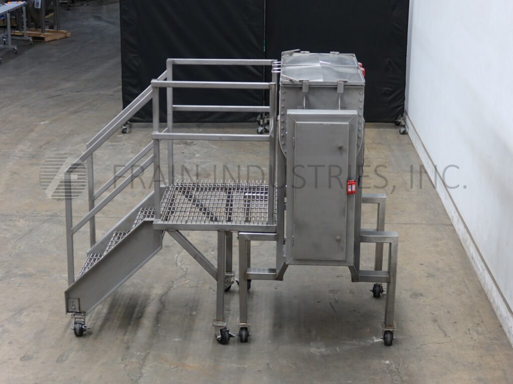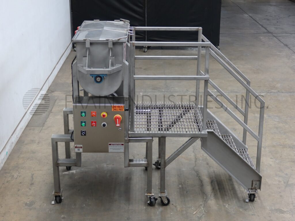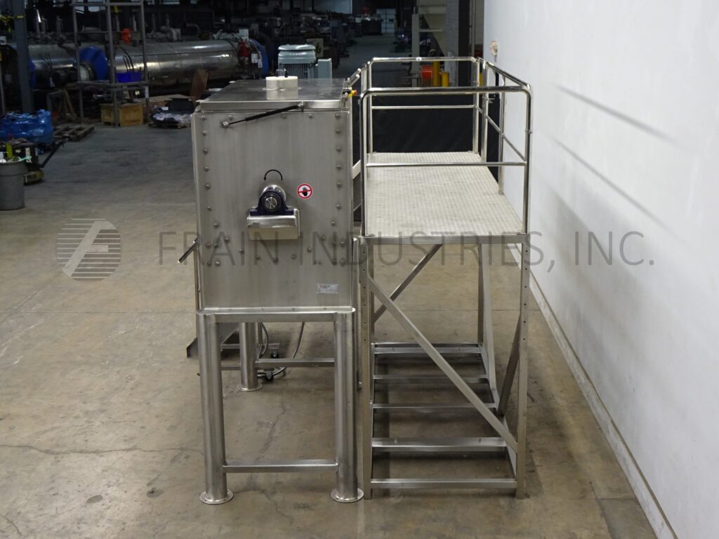 10 ft³, (7 ft³ working capacity), double ribbon mixer with pounds of product per hour – depending on materials and application. 304 stainless steel contact parts. Inner mixing chamber dimensions of 43" in Length; 18" in Width; 22" in Depth. Equipped with flip up cover, lift out safety screen, 1½" OD motor shaft, 1" wide x ¼" thick (outer) and 1(1/8)" wide x ¼" thick (inner) stainless steel ribbons. 3" OD center bottom discharge with slide gate valve and 49" floor clearence. Powered by a 1½ Hp motor. Mounted on stainless steel (6) leg frame with a 40" x 32" standing platform.