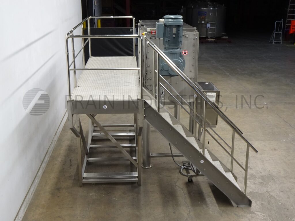 Morcos, Model RM1000, 40 ft³, (35 ft³ working capacity), double ribbon mixer with pounds of product per hour – depending on materials and application. 316L stainless steel contact parts. Inner mixing chamber dimensions of 76" in Length; 30" in Width; 33" in Depth. Equipped with flip up cover, lift out safety screens, 2¾" OD motor shaft, 2" wide x ¼" thick (outer) and 2½" wide x (¼)" thick (inner) stainless steel ribbons. 11" OD center bottom discharge with 50" floor clearence and 14.75 Hp motor. Mounted on stainless steel (4) leg frame with 41" wide x 143" long stainless steel platform set 70" off the ground with 36" high rails and a 7-step staircase.