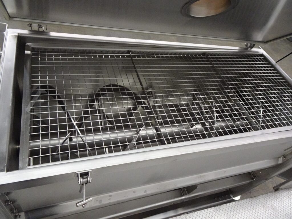 American Food Equipment Company, 304 stainless steel, 80 ft³ total (50 ft³ workable), dual shaft mixer with pounds of product per hour – depending on materials and application. Inner chamber dimensions: 89" in Length; 49" in Width; 36" in Depth. Equipped lift up safety grate, (2) 3" OD shafts with 8" x 13" stainless steel paddles independently powered by 10 Hp motor drives, (2) 22" wide x 8½" high end discharges with pneumatic covers and 29" ground clearance. Control panel has push button start / stop, and forward / reverse switch. Mounted on stainless steel (4) leg base frame.