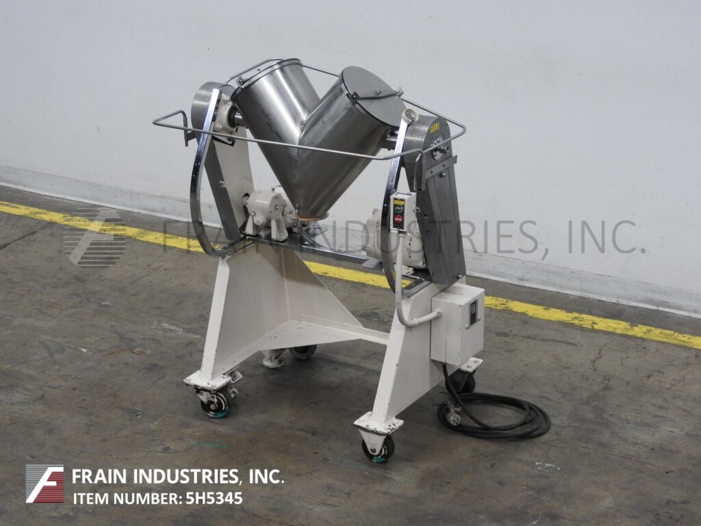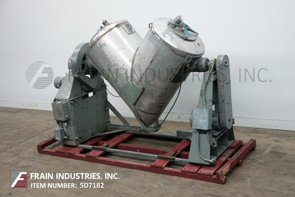 Patterson Kelly, 1 ft³, 304 stainless steel, twin shell mixer. Pounds of product per hour – depending on materials and application. Equipped with (2) 9¼" ID product ports with bolt down covers, (2) 16" long side V-Walls and (2) 6" long inner V-Walls, 4½" x 2" discharge with 27" ground clearance, shell powered by (1/8) Hp drive. Requires 49" ceiling clearance with 10" swing radius / 20" swing diameter.