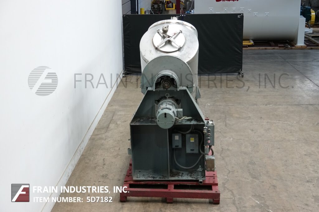 Patterson Kelly, Model 40 ft³, 304 stainless steel, twin shell mixer. Rated up to 65 lb/ft³ total. Equipped with (2) 18" ID product ports with bolt down covers, (2) 64" long side V-Walls, (2) 24" long inner V-Walls and liquid solids bar powered by a 15 Hp drive. 10" ID flanged discharge with 41" ground clearance. Shell powered by 5 Hp drive. Requires 145" ceiling clearance with 50" swing radius / 100" swing diameter. Mounted on heavy duty base frame.