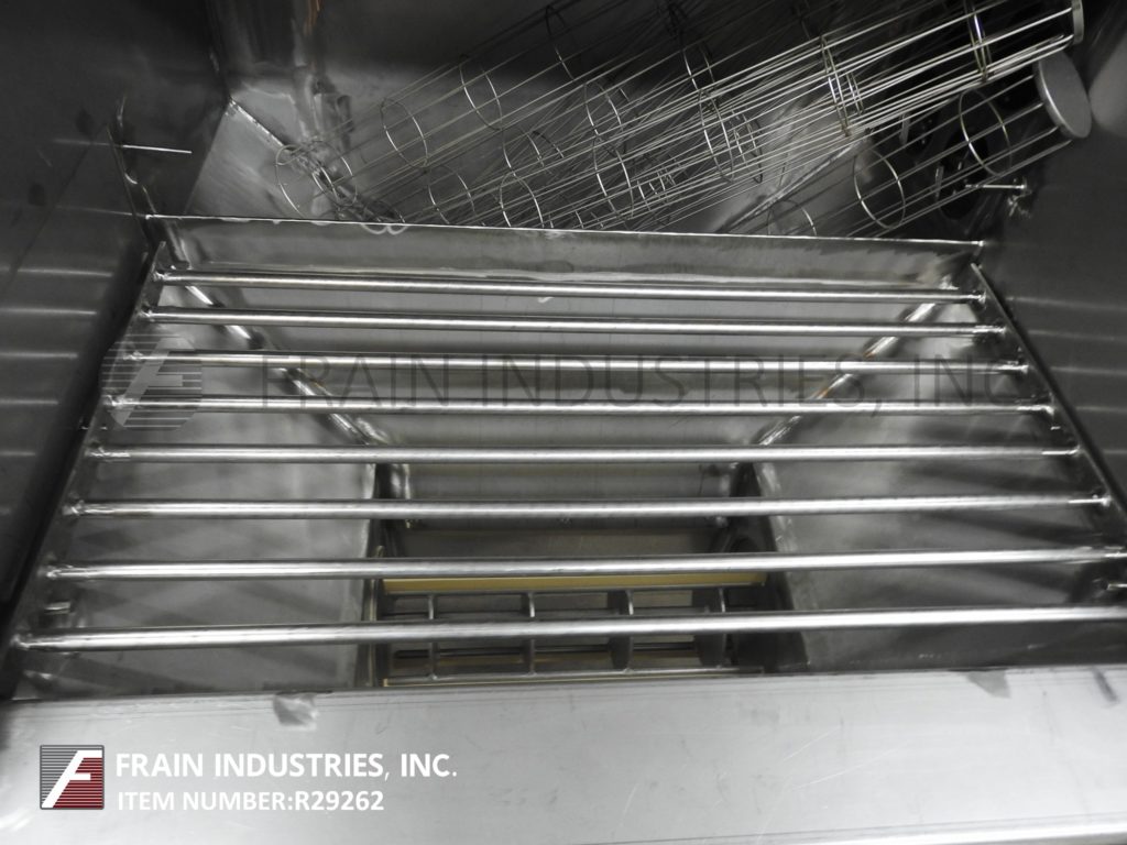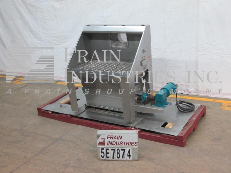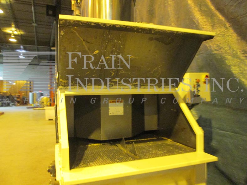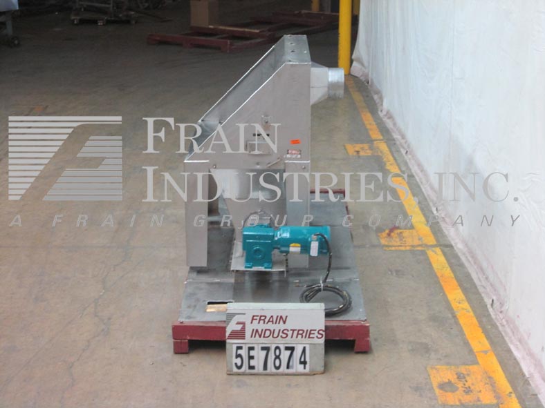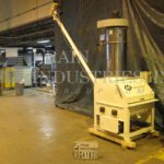 Young Industries Model MI-1009, stainless steel, self contained bag dump, unloading and dust collection system with pounds of product per hour – depending on materials and application. Equipped with 45" long x 36" wide product bag dump access port with flip-up cover x 30" deep pyramid shaped hopper with magnetic safety grid and bottom 7" OD product screw discharge with 3/4 Hp motor drive and onboard 8-bag dust collector with top mounted 1.5 Hp fan motor drive. Control panel has cycle timer, fan and delumper start / stop, discharge open / close switches, mixer start / stop and e-stop controls with Dayton photo helix guage. Mounted on (4) leg stainless steel frame.