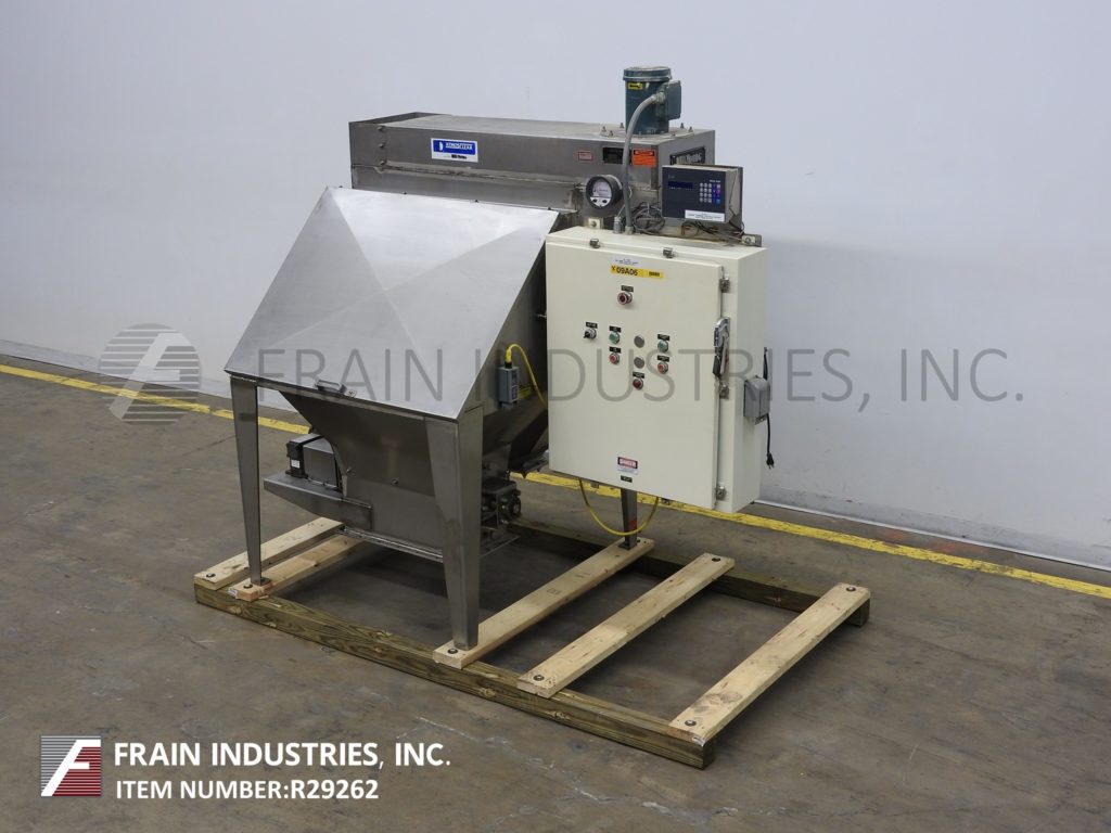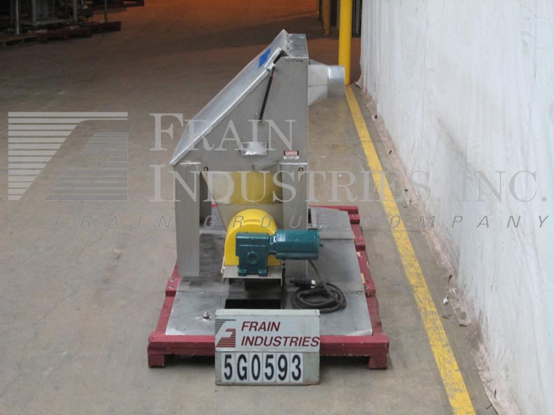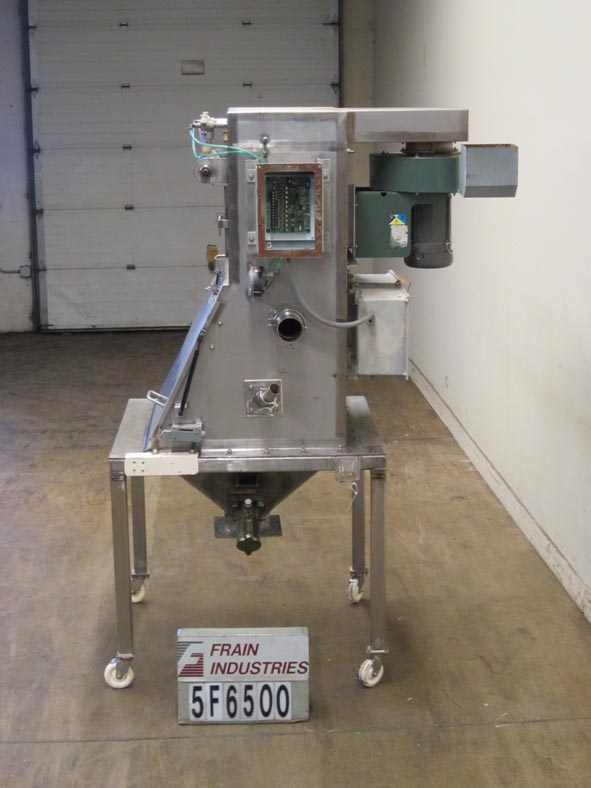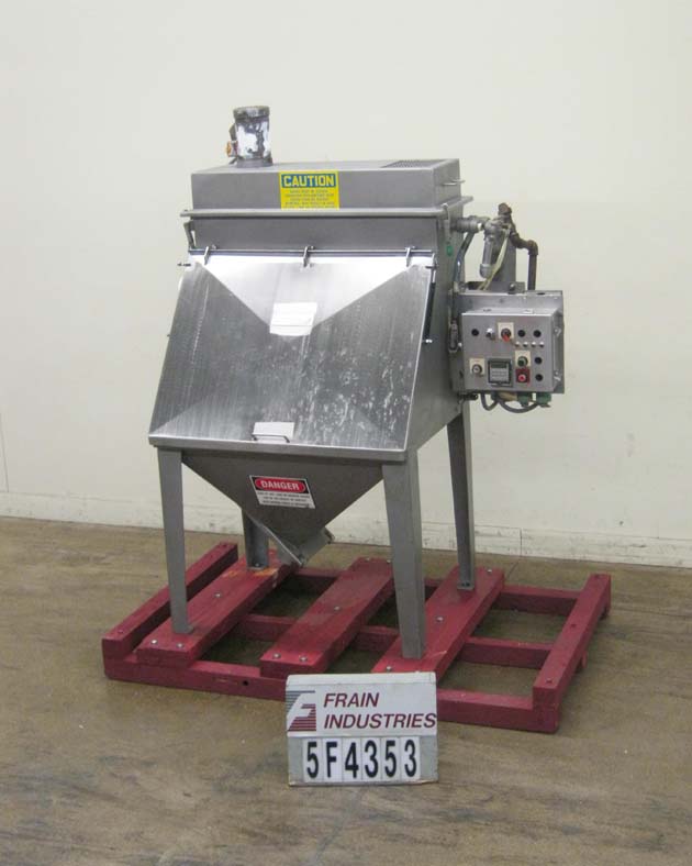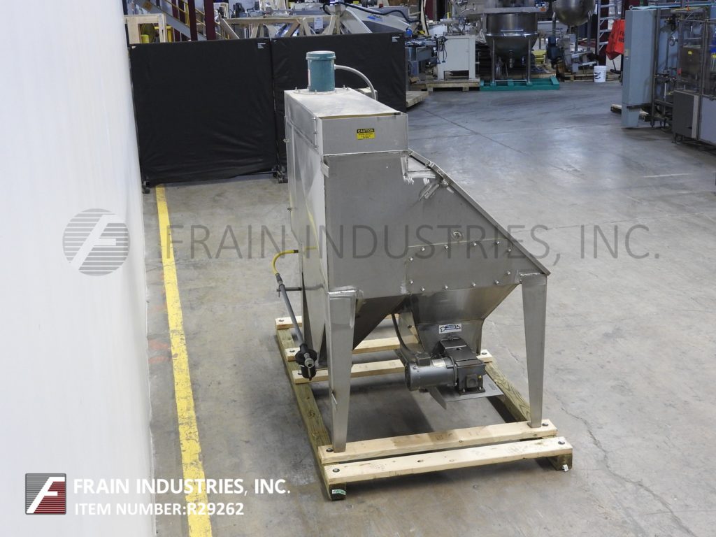 Young Industries Model MI-1010, stainless steel, self contained bag dump and dust collection system with pounds of product per hour – depending on materials and application. Equipped with 45" long x 36" wide product bag dump access port with flip-up cover x 30" deep pyramid shaped hopper with magnetic safety grid and bottom 7" OD product screw discharge with 3/4 Hp motor drive and onboard 8-bag dust collector with top mounted 1.5 Hp fan motor drive. Control panel has cycle timer, fan and delumper start / stop, discharge open / close switches, mixer start / stop and e-stop controls with Dayton photo helix guage. Mounted on (4) leg stainless steel base frame.