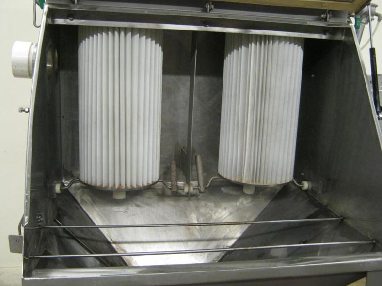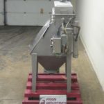 Vac-u-Max, Model Z65702/01, 14 ft³ bag dump station with integrated dust collection system. Volumes of product per hour – depending on materials and application. Equipped with flip open front product cover with safety grate and 1½ hp top mounted blower motor. Dust collection system with (12) bag filters and dual pulse filter cleaning feature. Cone bottom discharge with vibrator feeds to a pneumatic slide gate lock with 2½"OD / 2" ID Tri-clamp fitting for connection to in house vacuum transport system. Mounted on (4) leg base platform.