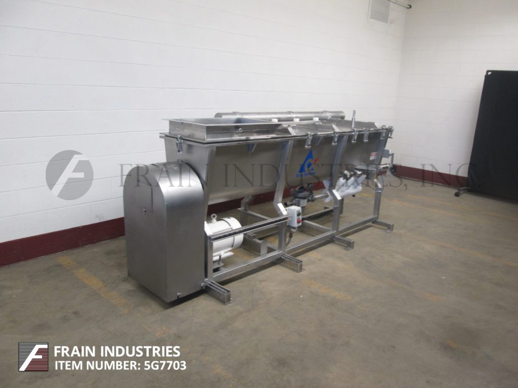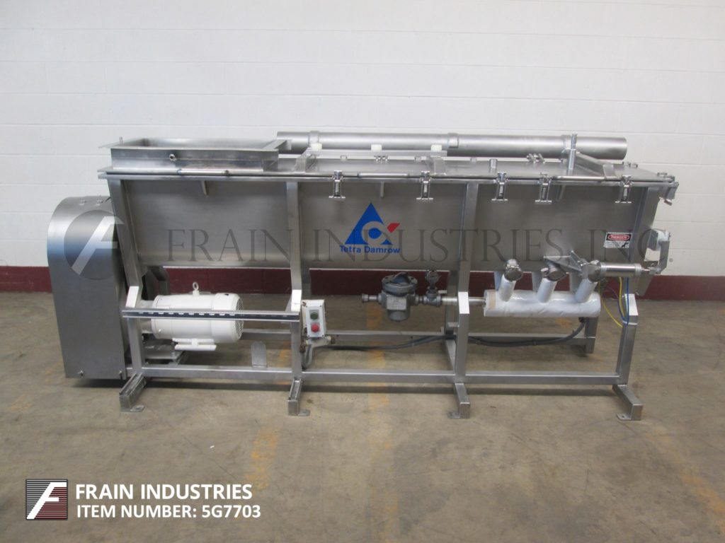 Damrow, Model Single Screw, 316 stainless steel, direct steam, batch cooking system and rated from 100 to 600 lbs of product per batch – depending on materials and application. Equipped with 98" long x 16" wide x 18" deep cooking chamber with (3) thermowells, flip top bolt down cover with 17" wide x 27½" long product charge, 11" diameter screw on 3" OD shaft powered by 10 hp drive, 1" NPT style steam inlet port with steam filter system, 8" x 2½" side end pneumatic product discharge with 20" floor clearance. Mounted on (8) leg base frame. Product is conveyed by the rotation of the screw.