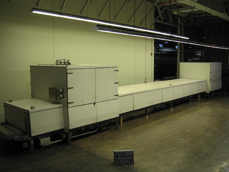 Baker Perkins, 36" wide chip depositor and cooling tunnel with number and pounds of product per hour – depending on materials and application. Stainless steel contact parts. Equipped with 39½" wide x 128" long product conveyor thru depositing section with (66) depositing heads and pistons (change part per application) with ¼" OD depositing nozzles. 39½" wide conveyor belt continues into 43" wide Kreuter cooling tunnel with (6) 94" long sections for a total chamber length of 564". Remote control panels have AB controls with touch screen HMI. Mounted on heavy duty frame.