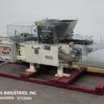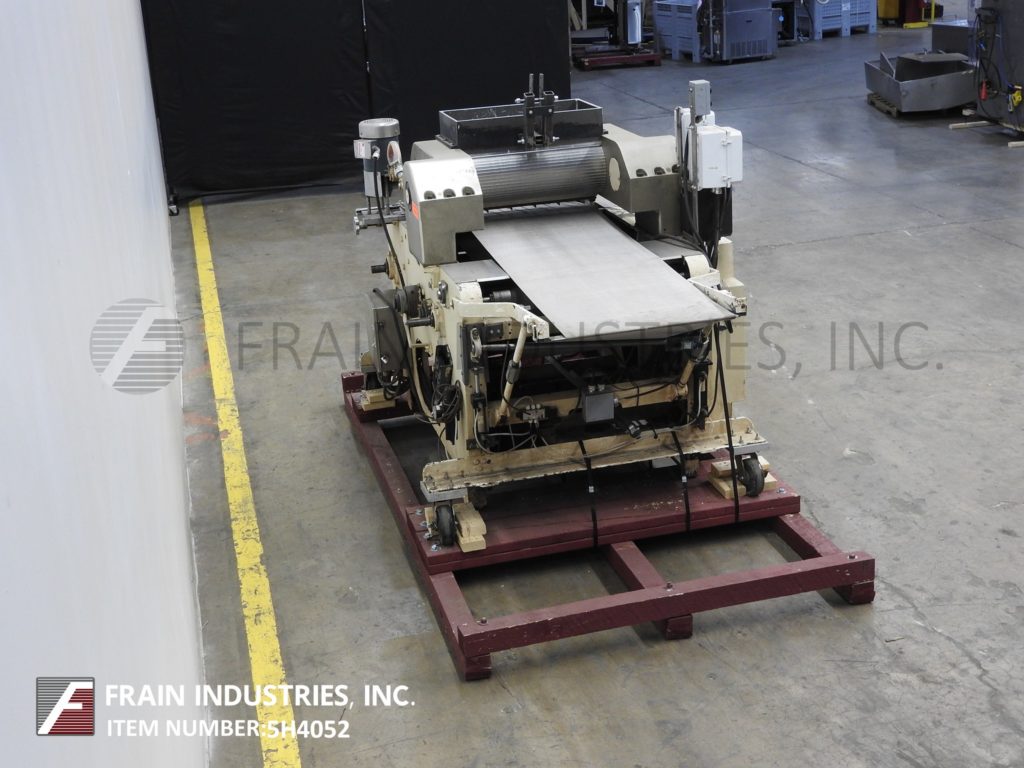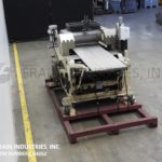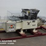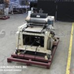 Werner, automatic, dual counter rotating roll, dough sheeter / extruder with amount of product per hour – depending on materials and application. Equipped with 24" long x 13" wide x 8" deep product hopper, (2) 8" OD x 24" long rollers, manual gap adjustment, die with wire cuttoff, hinged rear roll design, rotary die brush, direct gear drive, differential speed cylindrical rolls, open frame design and a 94" long x 24" wide product conveyor, with on / off push button controls and vari speed controllers. Mounted on heavy duty base frame.