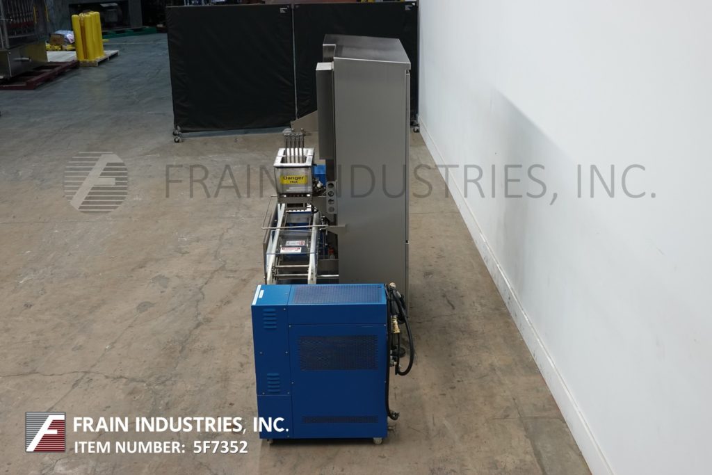 PTL, Model CD300, cluster depositor. Equipped with (6) 1¼" diameter x 8" deep pistons, 3" diameter x 17" wide rotary valve, jacketed hopper / depositing head with self-contained heating system and (6) oscillating nozzles. AB PanelView with 300 Micro touch screen display. The inclusion depositor offers the flexibility of being able to deposit chocolate with inclusions directly onto a belt, into cups or moulds. Unit able to deposit high inclusion rates including whole nut inclusions. Mounted on casters to roll over existing conveyor. Rate dependent on materials, application and machine configuration.