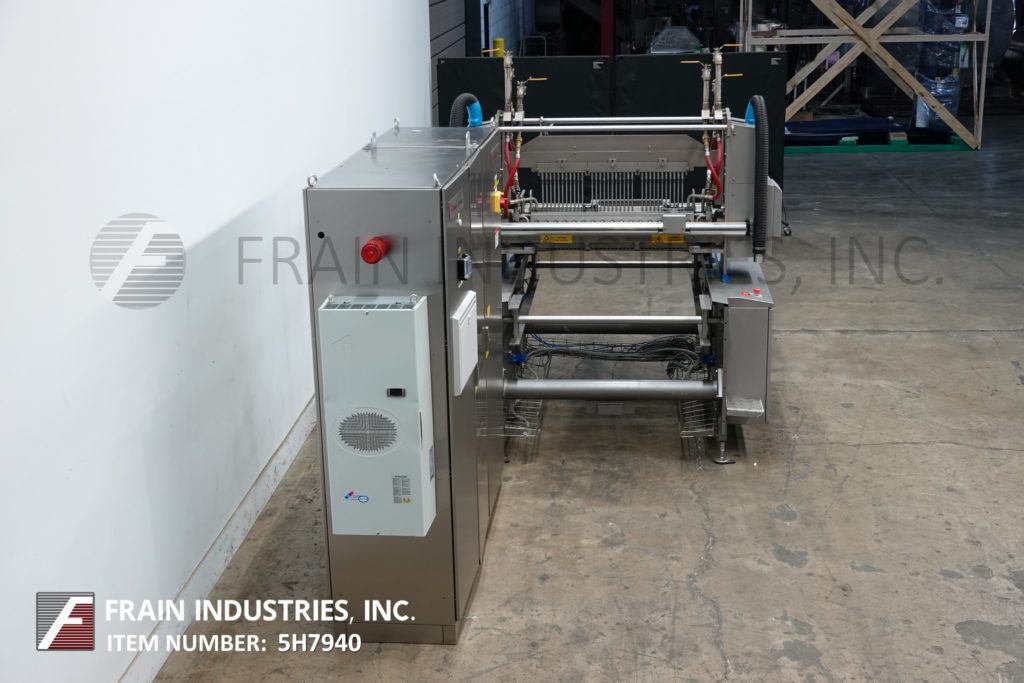 Loynds, model CD05, stainless steel, Mini servo driven depositing system. Rated up to 40 strokes per minute and up to 30 kg of product per hour – depending on materials and application. Equipped with 15½” long x 12¼” wide x 11″ deep electrically heated product hopper, 14 servo driven piston depositing heads and indexing conveyor, no tray / no deposit. Control panel has PLC controller with swing arm touch screen HMI display.