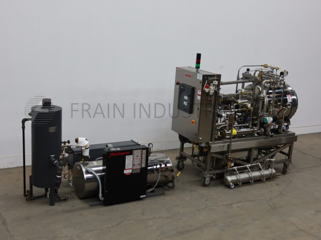 Allpax, model 2402, R&D small batch multimode shaka retort system. Capable of saturated steam, water spray, water shower, water immersion and steam-air processing modes. Unit is capable of multiple agitation modes including multiple speeds of reciprocation, end over end rotation, axial rotation, hydrostatic simulation and rocking – with proper change parts and machine configuration. Equipped with a orbital door, Reimers electric steam boiler and control panel with computer interface and chart recorder.