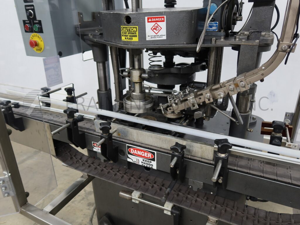 Resina Model S, automatic, inline, stainless steel, single head chuck capper rated from 10 to 40 containers per minute – depending on materials and application. Cap size range: 13mm to 70mm. Container size range: up to 4-1/2" in diameter x 10" in Height. Equipped with 153" long x 4" wide plastic delron container conveyor, with adjustable guide rails, cap bowl feeder. cap hopper with disc sorter, cap shute, cap transfer button and dual container grippers with single head chuck cap tightner, no container / no cap sensor eye, vari speed controller with start, stop, e-stop push button controls and interlock safety guarding. Mounted on base frame with height adjustable legs. Size range requires change parts per application.