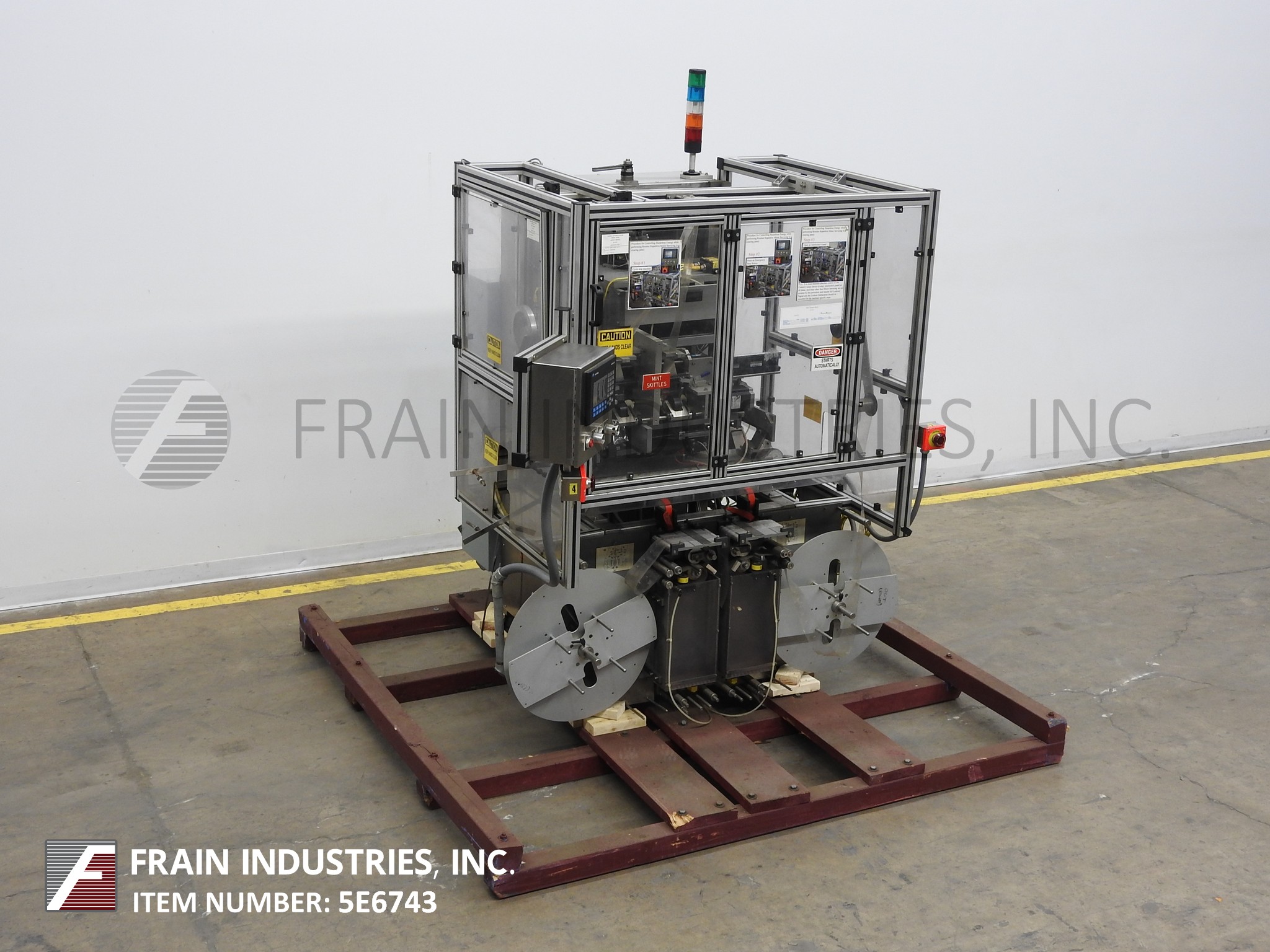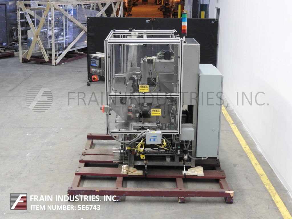 PDC Model 90-2E, automatic, high speed, dual head / dual reel neck bander / sleeve applicator combined thru rates from 50 to 400 containers per minute – depending on materials, application and machine configeration. Size range: 3/8" to 3" in diameter; 5/8" to 5" in height (with proper chage parts). 120mm maximum lay flat band width, minimum flat band width per application. Equipped with dual heads for continuous operation (one running while other loading) dual timing screws, dual powered film unwind, low film sensors, band pre-shrink, no container / no band sensor, static eliminator, Siko gauges, stepper band feed drives. Control panel with Allen Bradley PLC and Panel view operator interface. Additional features include dual speed capability (senses product infeed volume and adjusts machine speed accordingly) and Lexan guarding. Mounted on (4) leveling leg base frame.
