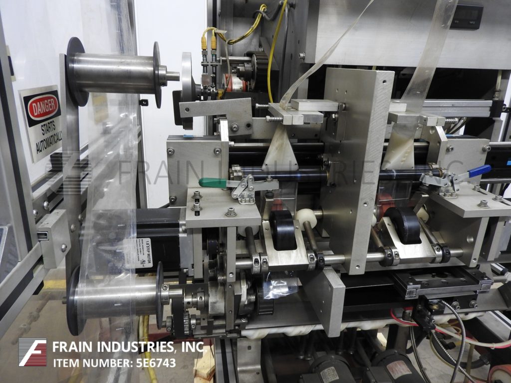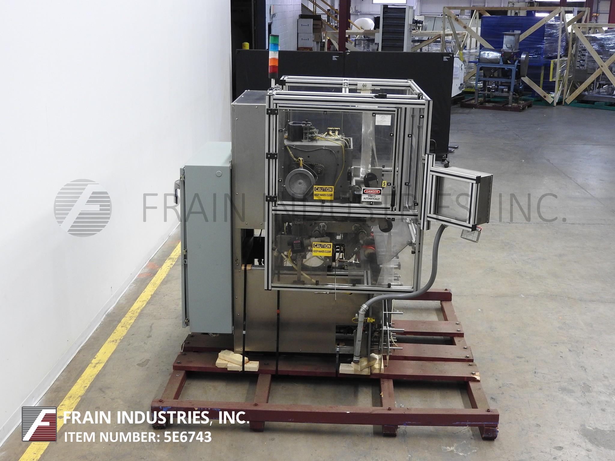 PDC model 75ERL, automatic sleever / neck bander with shrink tunnel. Rated from 50 to 300 containers per minute – depending upon materials and application. Size range; 3/8" to 3" in diameter and 3/4" to 7" in height. Equipped with 24" product infeed screw, splicing table, knife cut off, low and out of material sensors, registration. Control panel has A/B PLC with touch screen controller. Mounted on (4) leg height adjustable frame with iterlocking safety guarding.