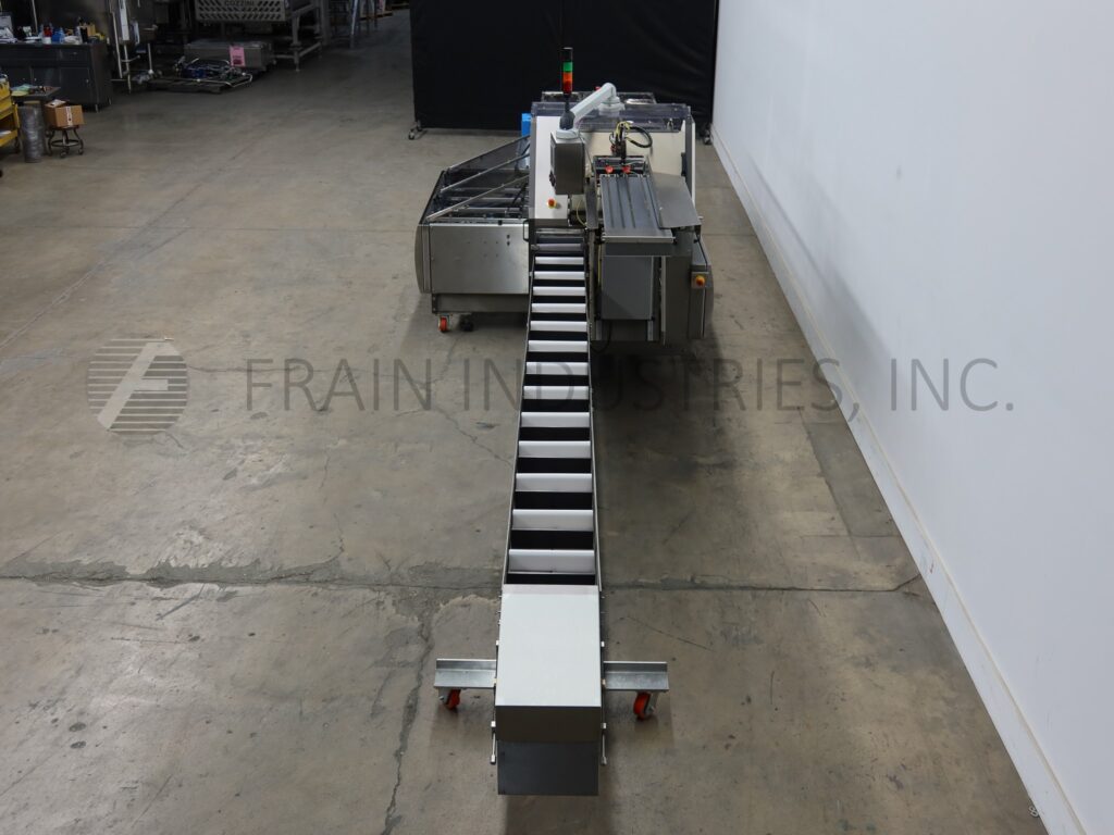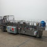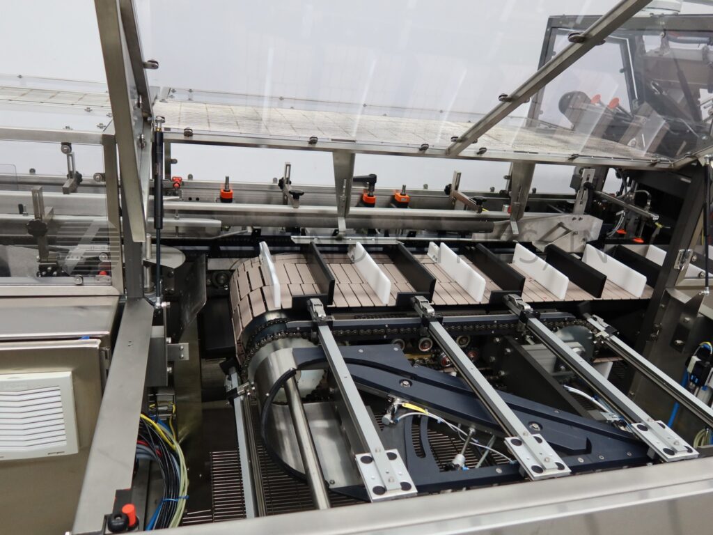 Automatic continuous motion horizontal cartoner rated from 50 to 400 cpm – speeds depending on materials and application. Carton size range: 20 to 75mm in Length; 16 to 70mm in Width; 65 to 200mm in Depth. Equipped with 6′ adjustable bucket infeed, 4" centers, Nordson hot melt with stitch controller and internal vacuum pump.