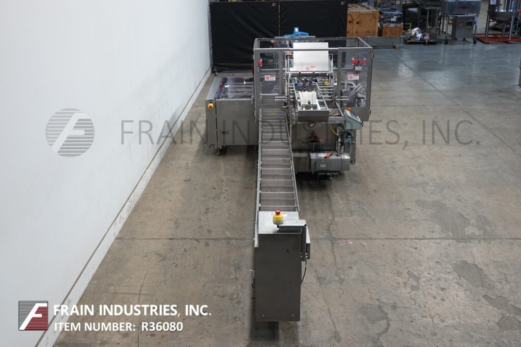 Jones Criterion Model 2000, Automatic, horizontal, intermittent motion, stainlesss steel, servo driven, hot melt glue cartoner rated from 10 to 100 cartons per minute – depending on materials and application Carton size range: 2" to 4" Long x 1" to 4" Wide x 7-1/4" to 15-1/2" Deep. All stainless wash down contruction. Equipped with 16′ Long x 24" Wide white neopreme product in feed conveyor to rotary bucket turrit feed system with 9-1/2" Long x 3-3/4" Wide x 1-5/8" Deep buckets to cartoner with (2) chain automatic blank carton magazine, (2) head rotary pic n place, (4) chains adjustable set on 6" centers with 5" High x 1-1/4" Wide lugs and (2) head, intermittent motion product loader ram arms, Nordson stainless steel Auqa Guard (2) gun hot melt glue system, 24" Long dual compression section with 34" discharge height. Control panel, has A/B CPU and swing arm panel view controller with start, stop and e-stop push buttons. Mounted on heavy duty stainless steel frame, with flip up interlock safety guarding and statis light.