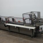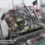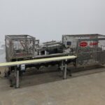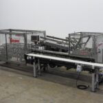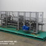 Langen Model B1, Semi-automatic, horizontal, continuous motion, hand load, hot melt glue cartoner, rated from 15 to 80 cartons per minute – depending on materials, application, machine configuration and operator dexterity. Carton size range: 1-3/4" to 12" long x 3/4" to 6" wide x 3-3/4" to 14" deep. Equipped with (4) chains adjustable set on 18" centers and 1" high x 2" long lugs, blank carton magazine, (2) head reciprocating vacuum carton pick n place, 9′ long load area, carton squaring rail, (2) gun hot melt glue systems with pattern controller, compression discharge and vacuum system with pump. Control panel with start machine jog, glue gun carton, vacuum pump, controls with e-stop. Tilt-able frame for gravity assist product loading. Mounted on base frame with barrier guarding and leveling legs.