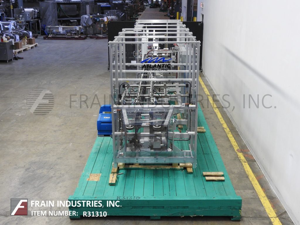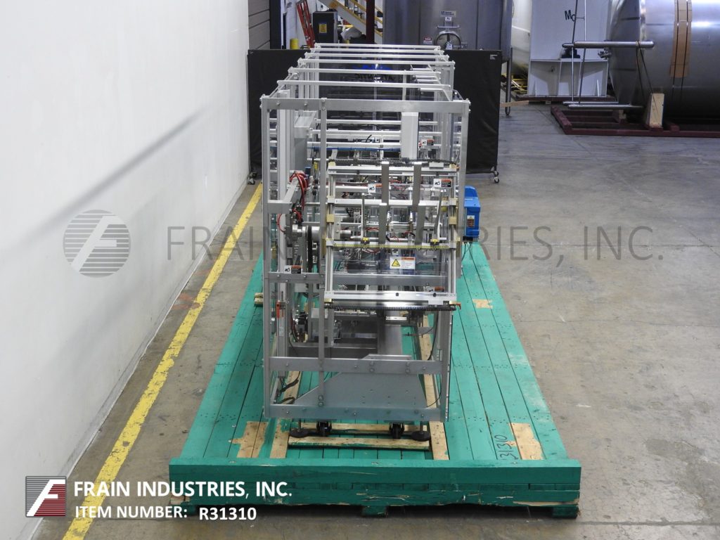 Adco, Model 15DBC105SS, Automatic, continuous motion, horizontal, hot melt glue cartoner rated from 25 to 125 cartons per minute – depending on materials and application. Carton size range: 1" to 9-1/2" in Length; 3/4" to 4" in Width; 4 to 12" in Depth. Equipped with (4) chains adjustable set on 12" centers and has 3½" high lugs, with automatic 46" belt blank carton magazine, (2) head rotary pic-n-place, with pre-break, no-product / no-carton, top carton hold down, barrel cam loader, Nordson hot melt glue unit and built in vacuum system. Control Panel has relay logic controller with machine, vacuum, speed, pattern control with jog / run, on / off switches and start, stop, e-stop push button controls and statis light. Mounted on heavy duty height adjustable frame with caster with leveling legs and interlock safety guarding.