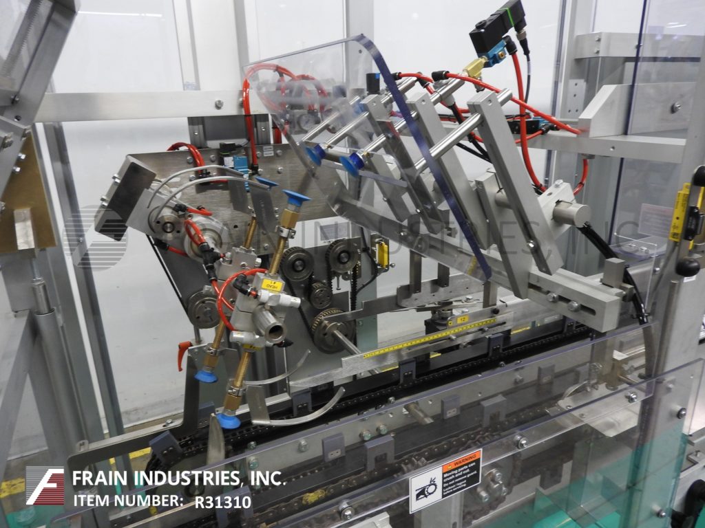 Langen, Model B1, Semi automatic, horizontal, hot melt glue cartoner, rated from 40 to 120 cartons per minute – depending on materials, application and operator dexterity. Carton size range: 1¾" to 12" in Length; ½" to 6" in Width; 3¾" to 14" in Depth. (4) chains adjustable set on 9" centers with 2" long x 3" high lugs, 96" long powered blank carton magazine, (2) head rotary vacuum pic n place, 72" long product hand load area, top squaring system, major flap plows, minor flap closers, Nordsen hot melt glue unit and vacuum system. Control panel has start / stop, jog / run, glue on / off and vacuum pump on / off. controls. Mounted on multi-leg frame with cage style safety guarding, casters and height adjustable leveling legs.
