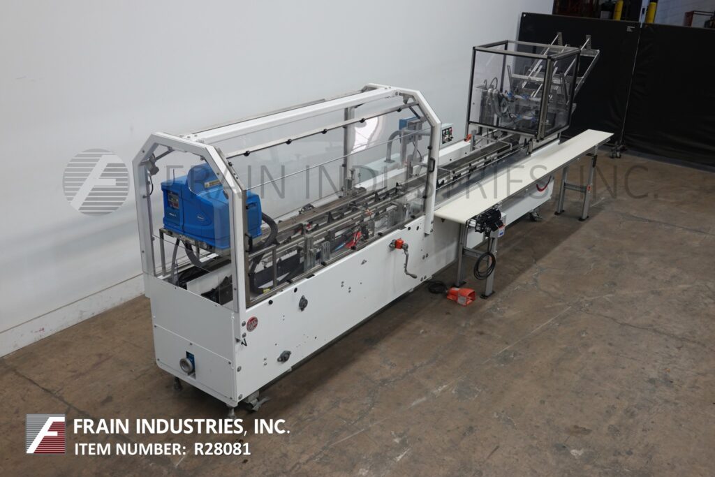 Adco, Model 15D105125EC, semi automatic, horizontal, hot melt glue cartoner rated from 25 to 125 cartons per minute – depending on materials, application and operator dexterity. Carton size range:1.5" to 9" in Length; 3/4" to 4" in Width; 4" to 12" in Depth. Equipped with (4) chains adjustable set on 12" centers, with 2-1/2" wide x 3-1/2" high lugs, 36" long blank carton magazine, with (2) head rotary vacuum pick n place, 84" long product hand load area, Nordson 2 gun hot melt glue system with major and minor flap closers and interlock flip-up safety guarding. Control panel has controller with start, stop, e-stop push buttons, on / off switches for glue, vacuum and controls with conveyor and speed control dials with self contained vacuum system and foot pedal jog. Mounted on a heavy duty base frame with leveling legs.