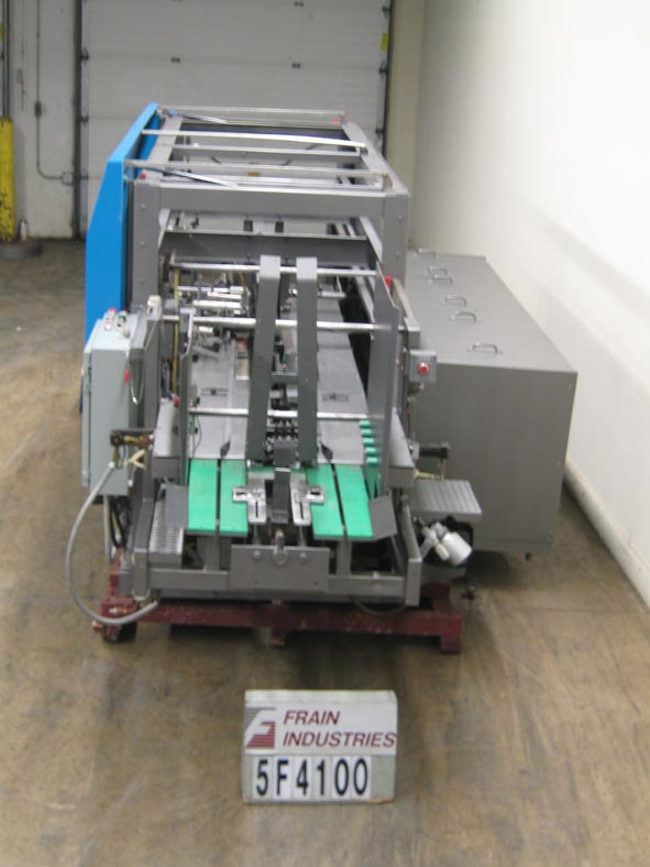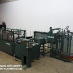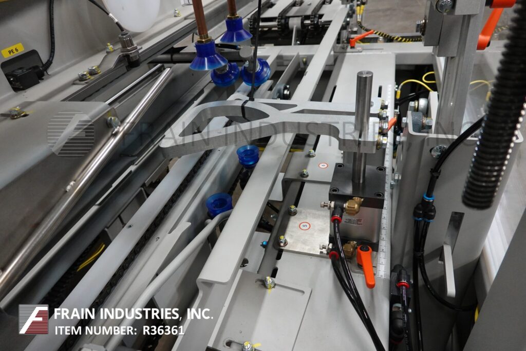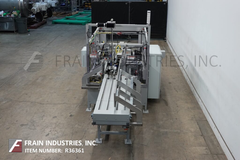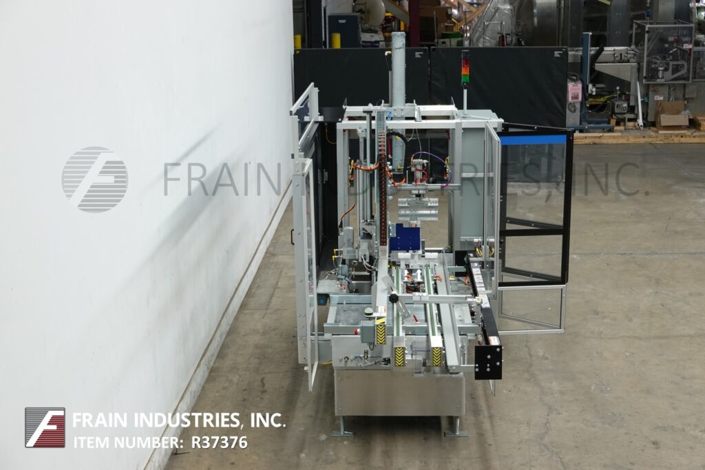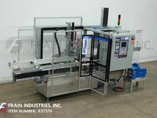 Wexxar, Model WF-30H, Automatic, in line case erector, bottom hot melt glue sealer. Rated from 5 to 30 cases per minute – depending on materials, application and machine configuration. Case size range: 9" to 18" in Length; 5½" to 14" in Width; 6" to 15" in Height. Equipped with 62" long (2) belt powered blank case magazine, pin and dome case forming plates, minor and major flap closers, case pusher bar, Norden ProBlue hot melt glue unit, servo driven auto size adjustment for quick changeovers and 32" long x 3" wide dual side belt discharge section with adjustable from 23" to 28" discharge heights. Control panel has PLC controller with panel view touch screen HMI, e-stop and status light bar. Mounted on base frame with leveling legs and safety guarding.