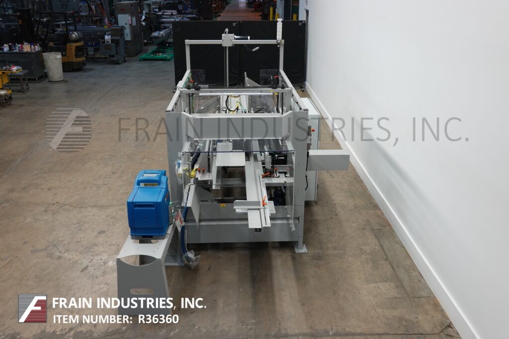 Wexxar, Model WF20H, Automatic, in line case erector, bottom hot melt case sealer. Rated from 5 to 20 cases per minute – depending on materials, application and machine configuration. Case size range: 7¼" to 18" in Length; 7¼" to 14" in Width; 6" to 115" in Depth. Equipped with 64" long (2) belt powered blank case magazine, pin and dome case forming plates, minor and major flap closers, pneumatic compression arm, 32" long x 3" wide dual side discharge conveyor belts. Control panel has A/B controller and touch screen HMI with reset and e-stop push buttons with status light bar. Mounted on (4) leg frame with slide door safety guarding and casters.