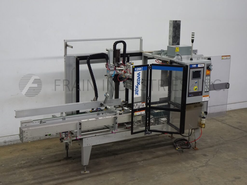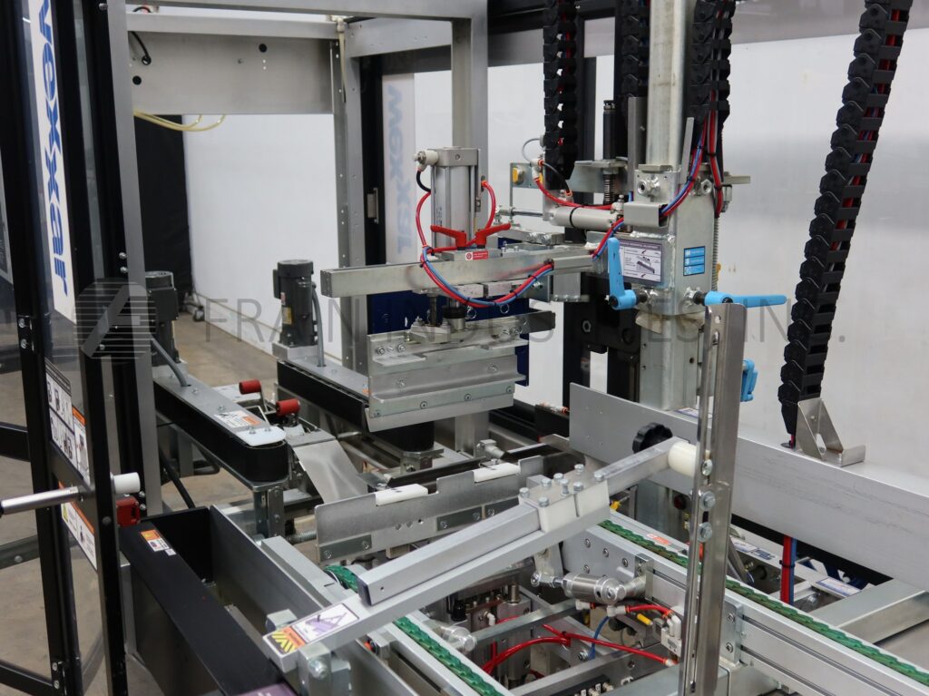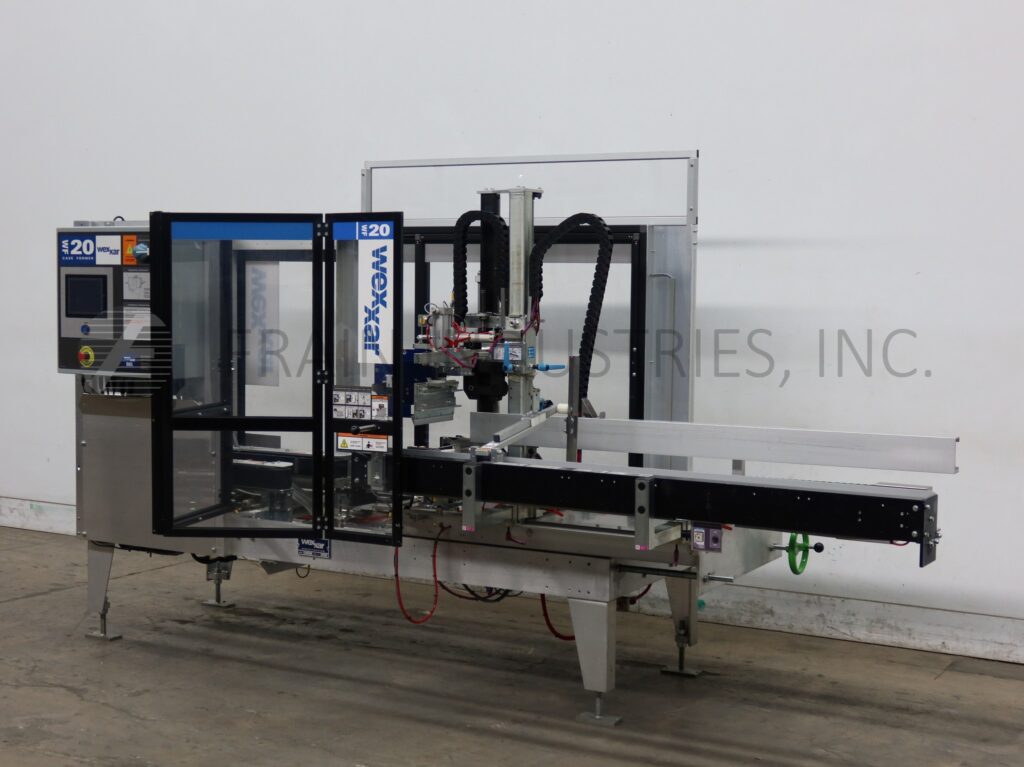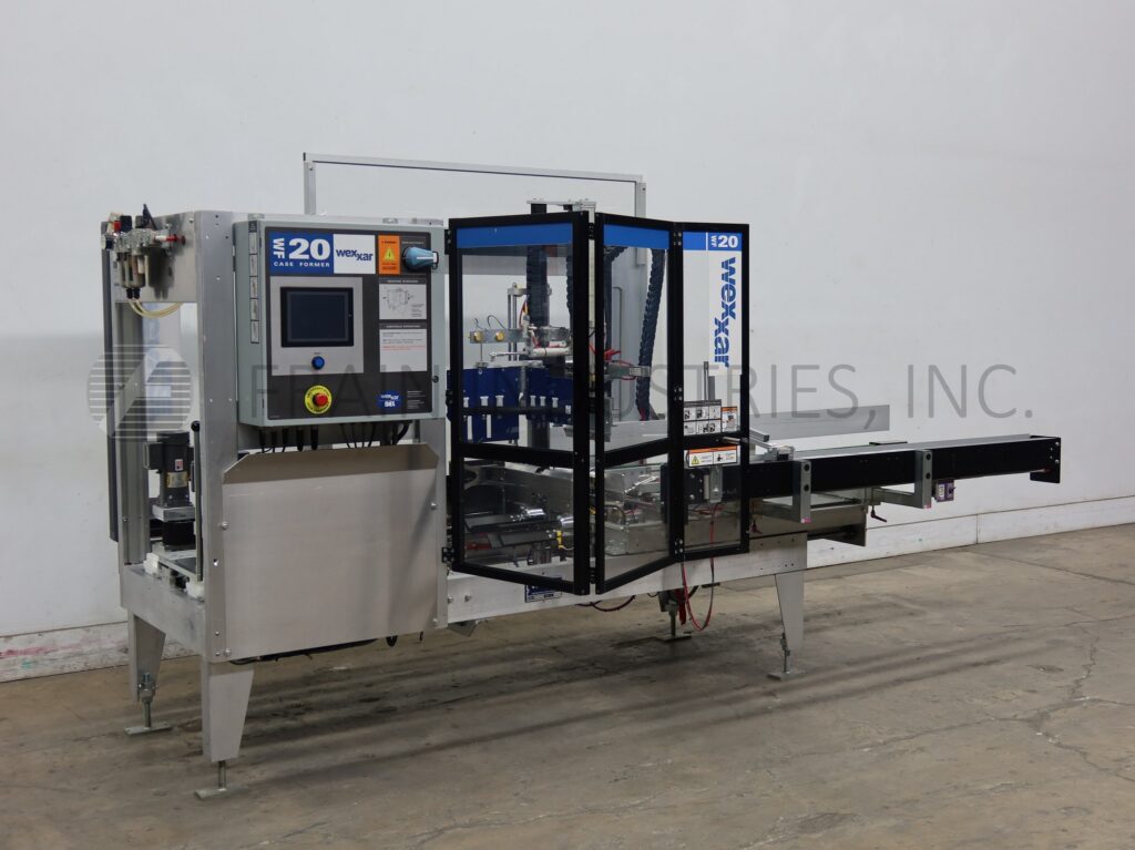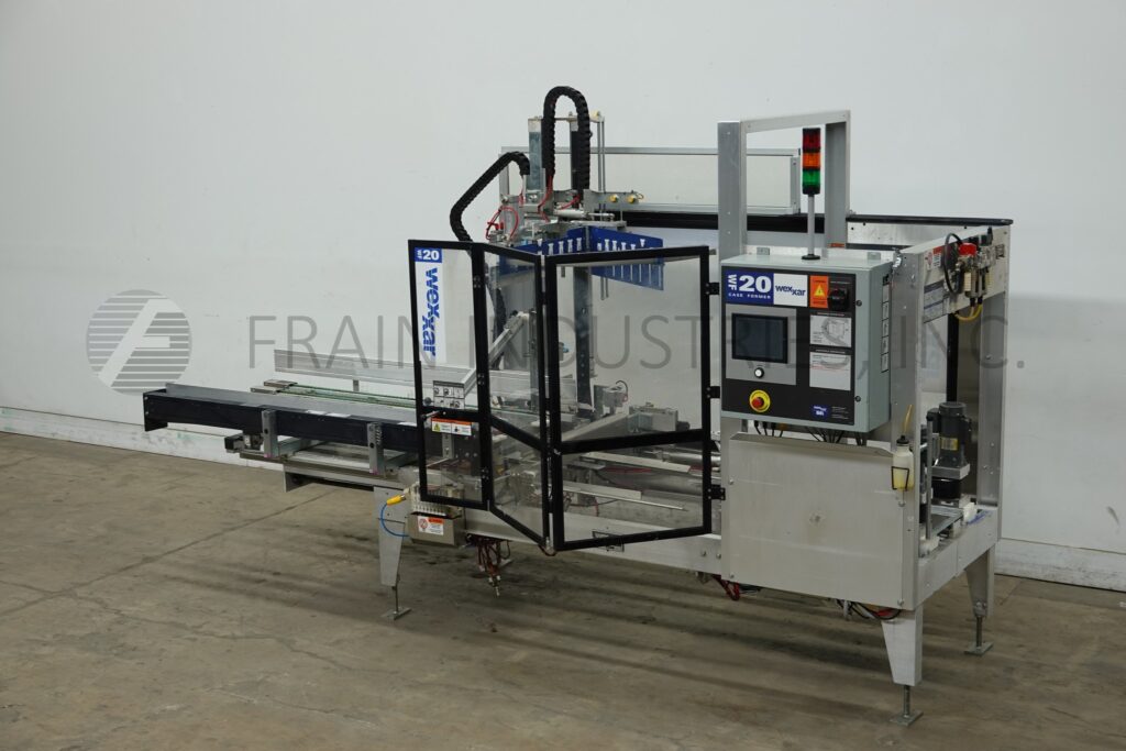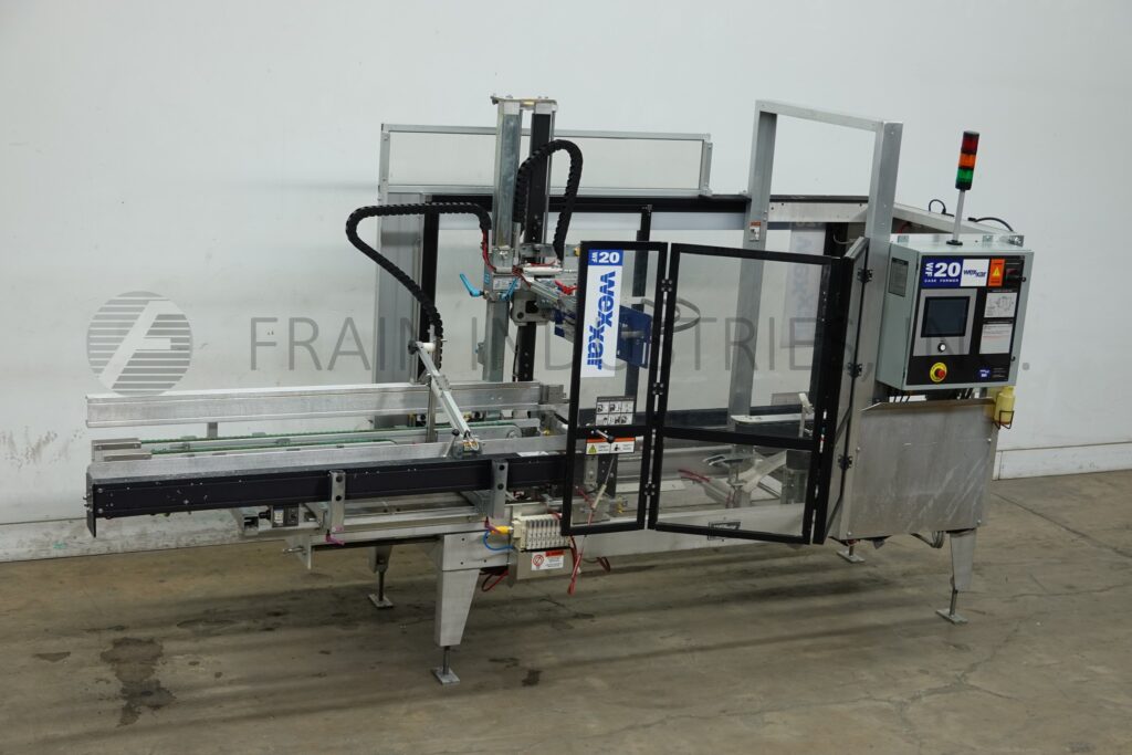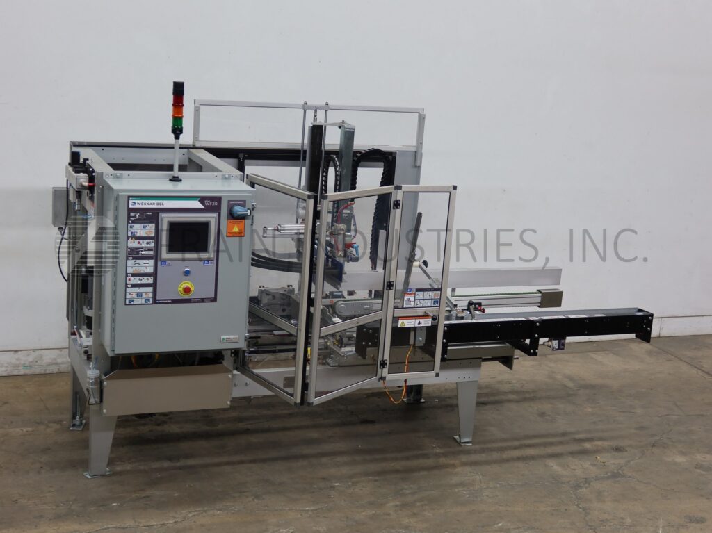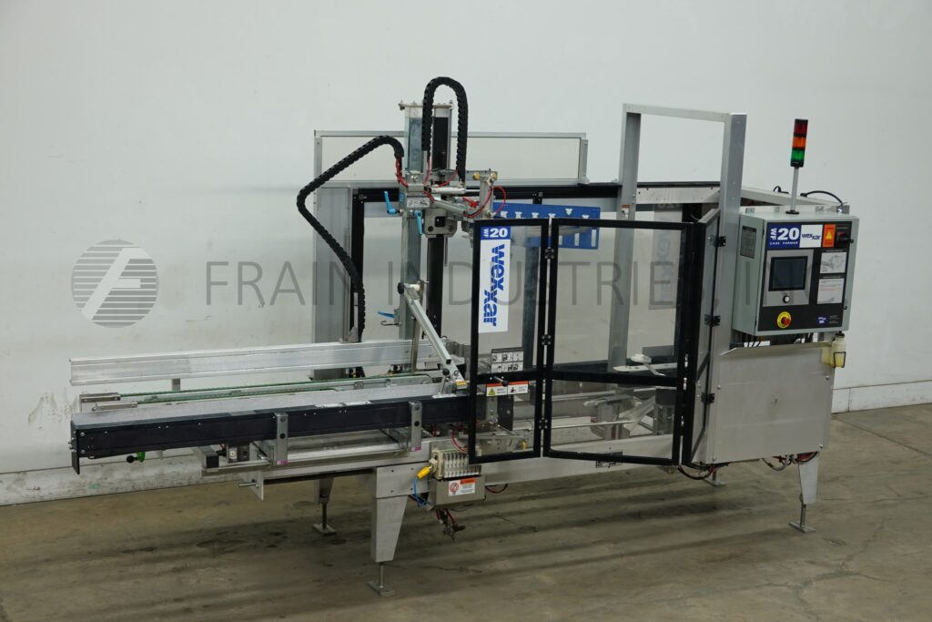 Wexxar, Model WF-20T, Automatic, in line case erector, bottom taper. Rated from 5 to 20 cases per minute – depending on materials, application and machine configuration. Case size range: 7¼" to 18" in Length; 7¼" to 14" in Width; 6" to 15" in Height. Equipped with 72" long blank case magazine, pin and dome case erecting system, minor and major flap closers, 3" bottom tape head, 32" long hand crank adjustable side gripper belts. Control panel with touch screen HMI. Mounted on (4) leveling leg frame with slide door safety guarding.