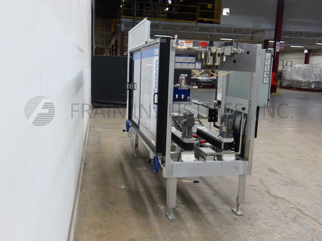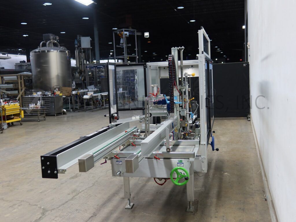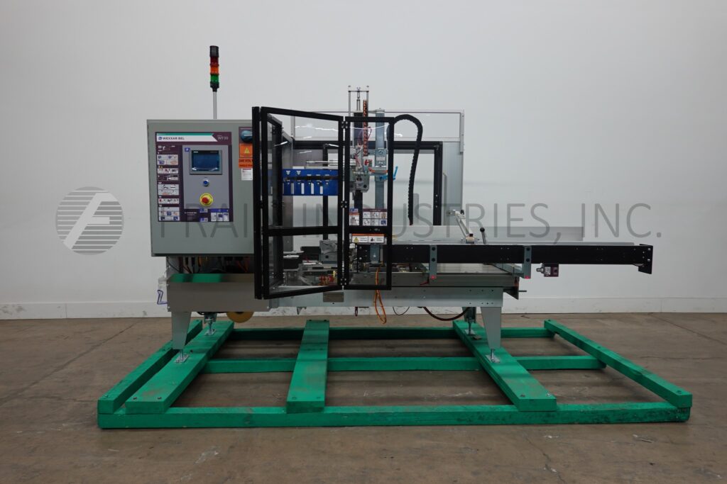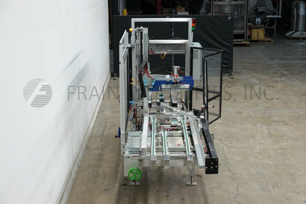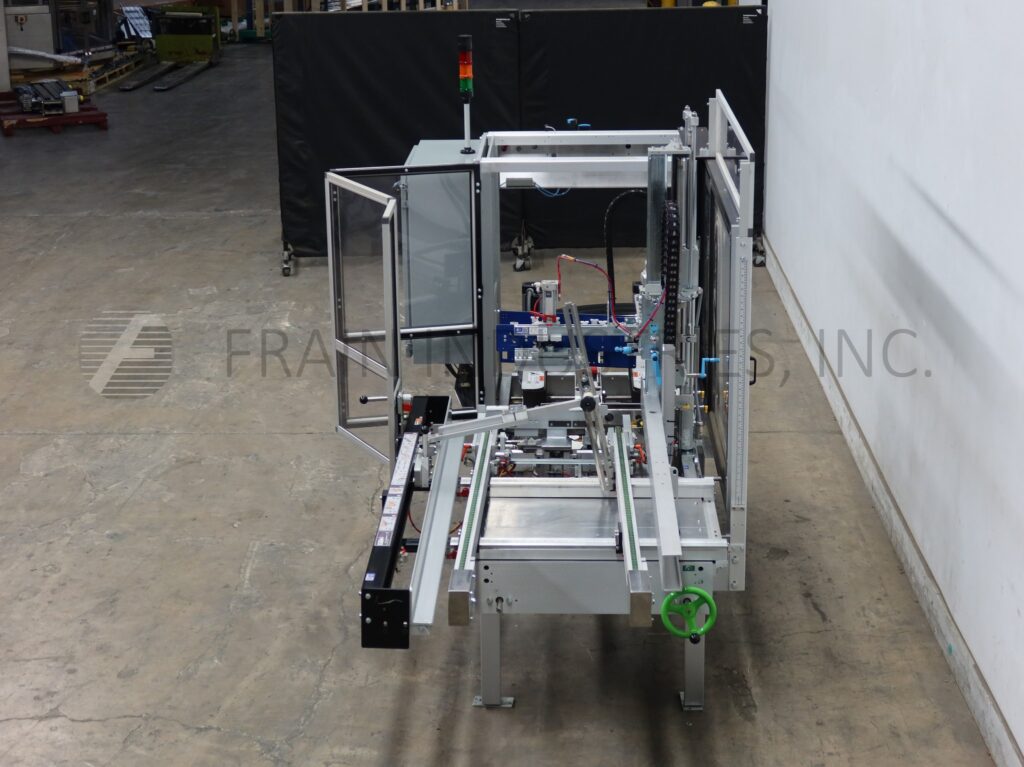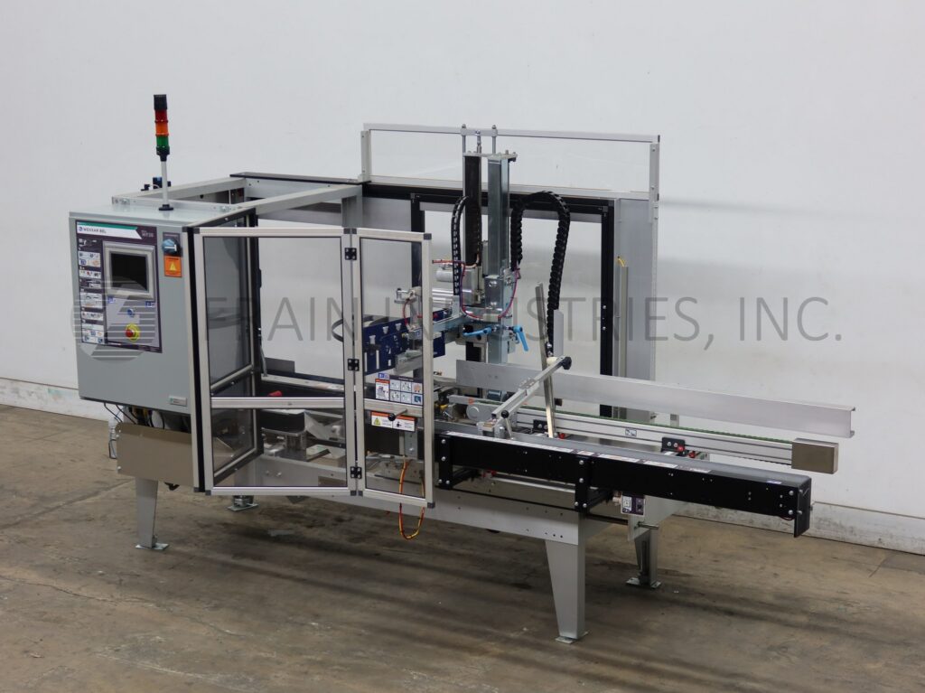 Wexxar Model WF-20T, Automatic, in line case erector, bottom taper. Rated from 5 to 20 cases per minute – depending on materials, application and machine configuration. Case size range: 7¼" to 18" in Length; 7¼" to 14" in Width; 6" to 16" in Height. Equipped with 62" long blank case magazine, pin and dome case erecting system, minor and major flap closers, 2" bottom tape head, with 32" long x 3" wide side case gripper belts. Control panel has touch screen HMI controller Mounted on (4) leveling leg frame with slide door safety guarding.