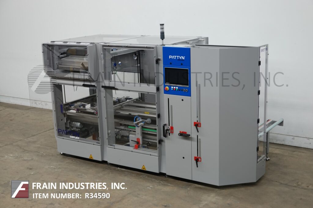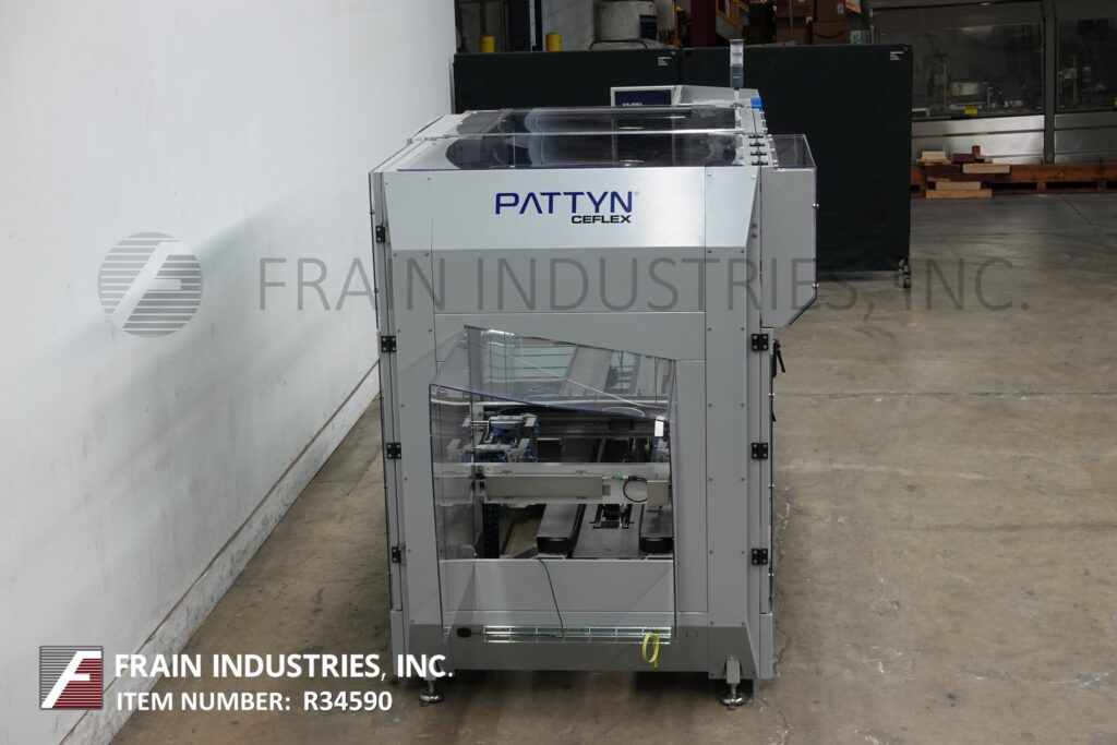 Pattyn Packaging Model CEFLEX-41, automatic, case erector, bottom taper and bag inserter rated from 2 to 12 cases per minute – depending on materials and application. Case size range: 12" to 24" in Length; 8" to 16" in Width; 6" to 25-1/2" in Depth. Flat blank range: 20" to 40" in Length x 14" to 34" in Width. Equipped with (4) chain auto blank case magazine and pneumatic tri-grip case erector and squaring arm with mechanical grippers, bottom flap closer, side flap plows and dual side belt case conveyors, with 2" bottom taper. Bag inserter which inserts pre-performed roll stock bags into cases, fitting all corners and cuffing the bag around the outer perimeter of the case with bag opening carriage, spoon and gripper design, (4) corner cuffing rods with air assit bag inset and is hand crank adjustable. Maximum film OD of 9" with 3" ID core. Control panel has A/B controller with panelview and start, stop, reset mode control switches, with safety guarding. Mounted on heavy duty frame with leveling legs.