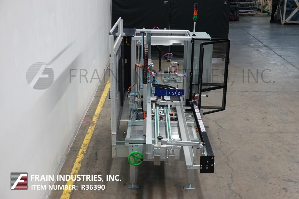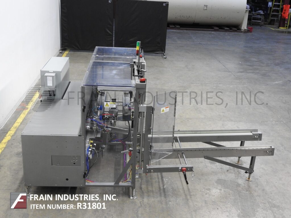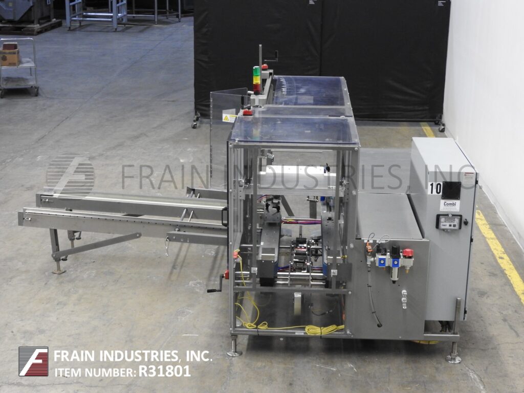 Combi America Model 2EZHS, automatic, case erector, bottom taper rated from 5 to 20 cases per minute – depending on materials, application and operator dexterity. Case size range: 8" to 24" in Length x 6" to 16" in Width x 5" to 18" in Height. Heavy duty welded steel construction. Equipped with easy load, 80" long automatic blank case magazine, (5) suction cup pic-n-place case erector, minor and major flap closers, 44" long x 3-1/4" wide dual side belt case indexing, 3" bottom tape head, hand crank no-tool adjustable, vacuum system and interlock safety guarding. Control panel has A/B controller with A/B panel view and safety reset, start, stop and e-stop controls with ethernet interface port and statis light bar. Mounted on height adjustable frame with leveling legs.