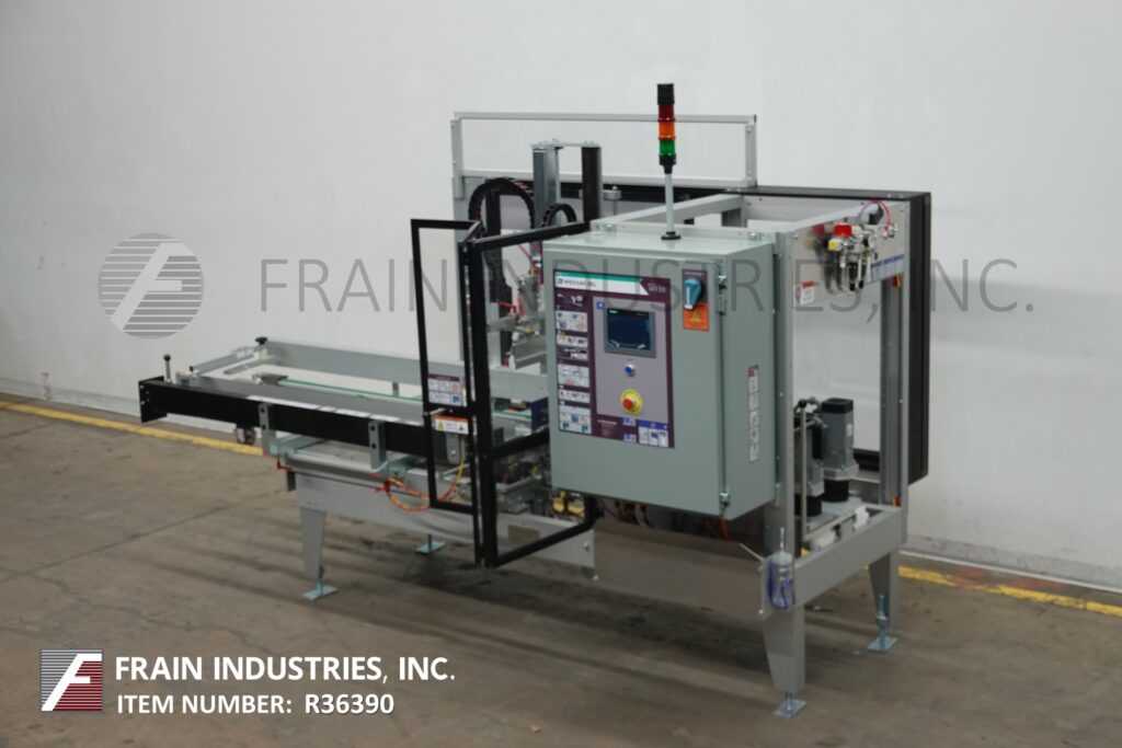 Wexxar, Model WF-30T, Automatic, in line case erector, bottom tape sealer rated from 5 to 30 cases per minute – depending on materials, application and machine configuration. Case size range: 7¼"" to 18" in Length; 7¼" to 14" in Width; 6" to 15" in Height and erects both RSC and HSC cases. Equipped with 72" long (2) belt powered blank case magazine, pin and dome case forming plates, minor and major flap closers, case pusher bar, 2" Dekka flip up tape head and 32" long x 15" wide dual side belt discharge section with 25" to 30" discharge height. Control panel has PLC controller with touch screen controls and panel view with digital dial indicator, e-stop and status light bar. Mounted on (4) leg height adjustable frame with safety guarding.