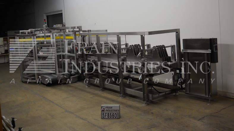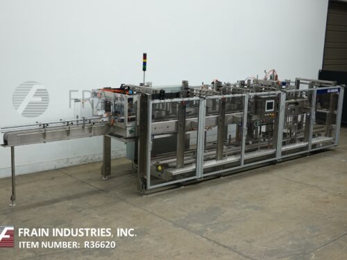Hartness International, Model 825, Automatic, intermittent motion, ascending, drop case packer rated from 10 to 30 cases per minute and number of product – depending on materials, application and pack pattern. Case size range: 6" to 24" in Length; 6" to 15-1/2" in Width; 1-1/2" to 19" in Height and is capable of handling a wide variety of glass, plastic and cans, as well as small, medium and large containers of different sizes and shapes with a size range from 2 ounces to 2-1/2 gallons (all with proper change parts). Equipped with 156" long x 16" wide top plastic delron product in feed conveyor with lane dividers and container aline station to ascending soft drop product pack grid (change part per application). Dual bottom 156" long x 4" wide delron case conveyors with lugged case feed conveyor and 64" x 4" dual delron discharge case conveyors. Control panel has CPU controller with reset and e-stop buttons. Mounted on heavy duty frame with interlock safety guarding and statis light bar.