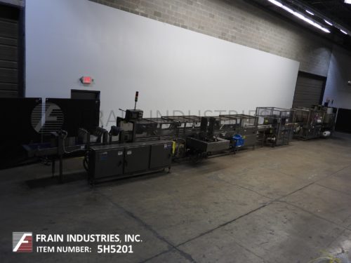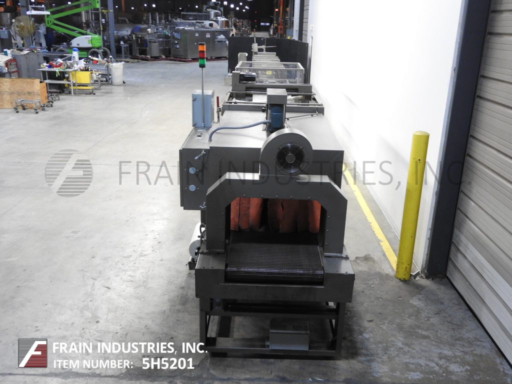 72" long x 17-1/4" wide canvas transfer conveyor to Arpac Model 45TW-28 shrink bundler and tunnel with (1) 36" x 19" wide and (1) 36" wide x 72" long in feed conveyors thru bundler, top and bottom film rolls with maximum film roll width of 27" and 14" OD has 29" wide seal jaws x 13" high total clearence, to single zone shrink tunnel with 36" wide x 19-1/2" high total aperture x 72" long shrink chamber with 29" wide x 108" long product conveyor thru shrink tunnel with top discharge cooling fan. Control panels have A/B controllers with touch pad controls. and readout. All mounted on heavy duty base frames with safety guarding and statis light bars.