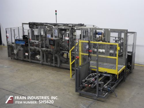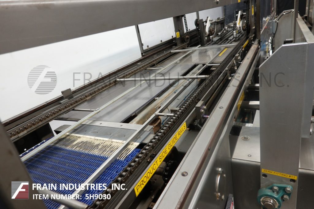 Arpac Model EL2111, automatic, intermittent motion, tray erector / packer / hot melt sealer rated from 5 to 25 trays per minute – depending on material and application. Tray size: Per application. Equipped with 128" long x 19" wide flexlink product in feed conveyor, with lane spacers and side guards, 48" long (2) chain automatic blank tray magazine, with single arm reciprocating pic n place, collation area with product stop, dead plate, product hold down with single over head product ram loader, 4 chain adjustable indexing conveyor set on 24" centers, with 3" wide x 5" high lugs, Nordson hot melt glue system with tray setup / squaring assembly and compression section. Control panel has A/B, controls with Arpac touch pad controller and panel view, interlocking safety guarding and statis light bar. Mounted on heavy duty base frame Capable of handling a wide range of product configurations and applications including: plastic bottles, cans, boxes, folding cartons, bags and glass jars.