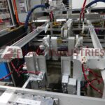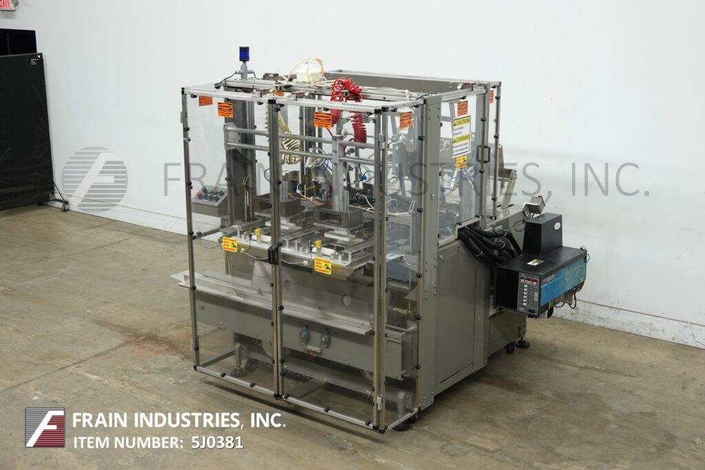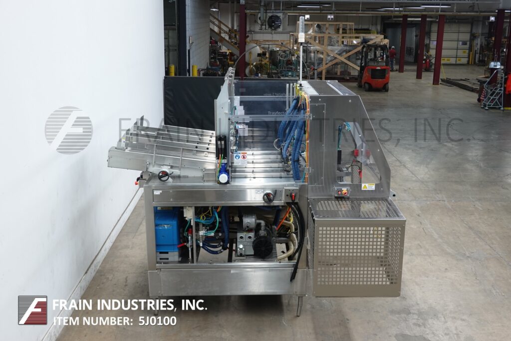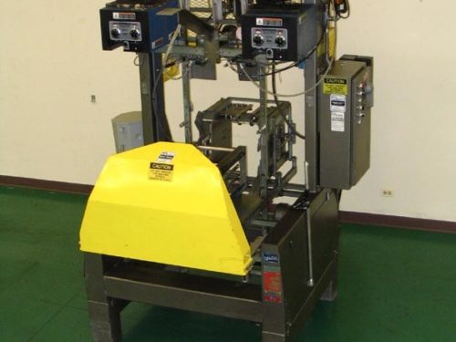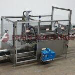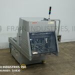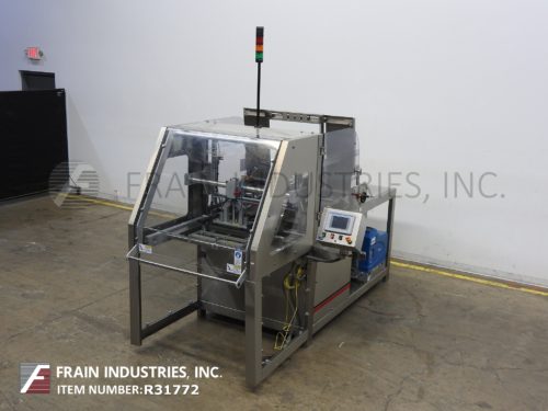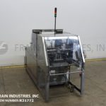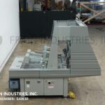 Delkor Model 752, Automatic, dual head, tray former rated up to 150 trays per minte – depending on materials and application. Right to left machine can an handle a varity of size ranges – depending on materials and application. Capable of handling both regular trays to tri-seals.and flat blanks up to (22" W x 30" L) and will form chipboard, corrugated, or poly coated materials.(with proper change parts). Currently set for chipboard tray (8" L x 5-1/2" W x 1 1/4" H). Equipped with dual (30" L x 6"W) powered tray feed magazine, with (2) suction cup vacuum pick-in-place, Nordson IV (4) gun hot melt glue system, (6′ L x 8 1/2" W) product conveyor and Allen bradly controls. Last running in a snack food operation.
