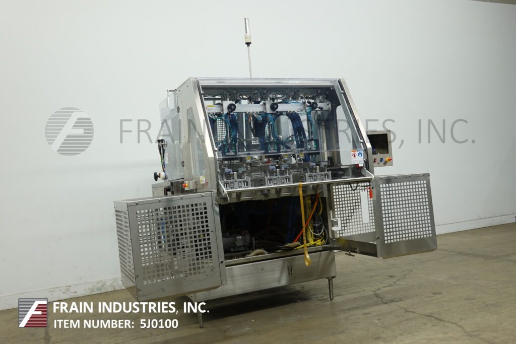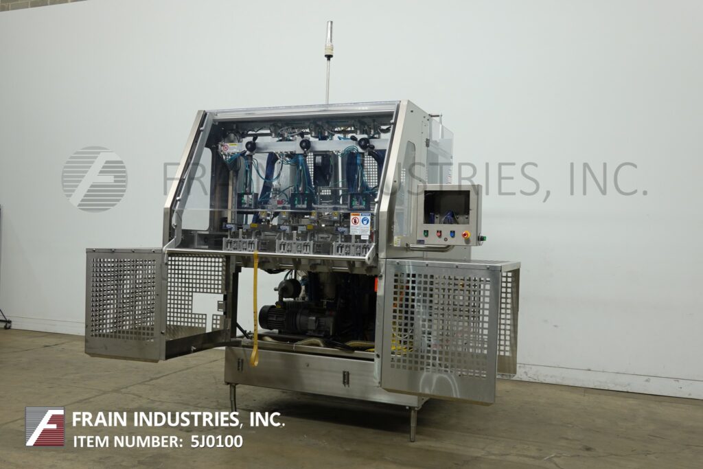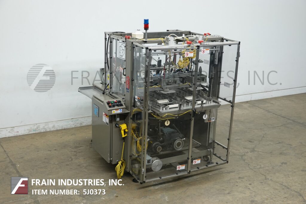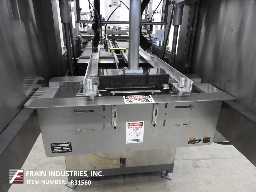 Delkor, Model 742, automatic, dual head, tray former, rated from 60 to 150 trays per minute – depending on materials, application and machine configuration. Blank Tray size: up to 22" in Length; up to 30" in Width. Equipped with (2) 24" long blank tray magazines, dual (3) suction cup reciprocating pick and place, shuttle indexing system, ram plunger, tray forming station, Lexan safety guarding. Control panel has sart, stop and e-stop push button controls Mounted on (4) leg base frame.