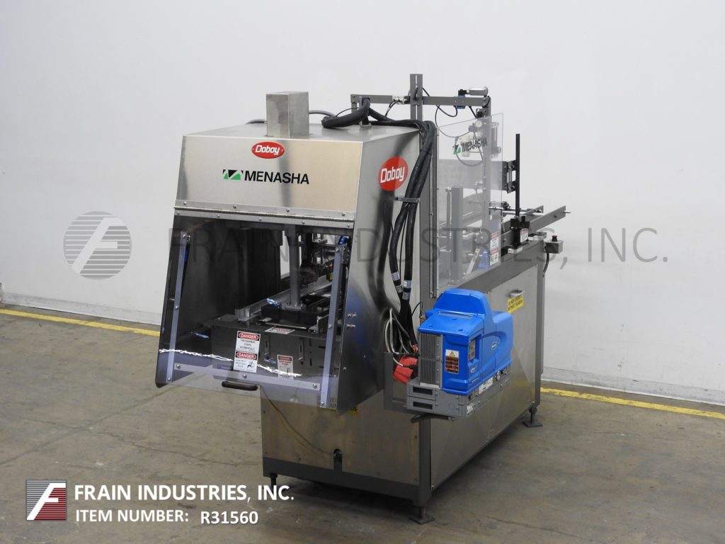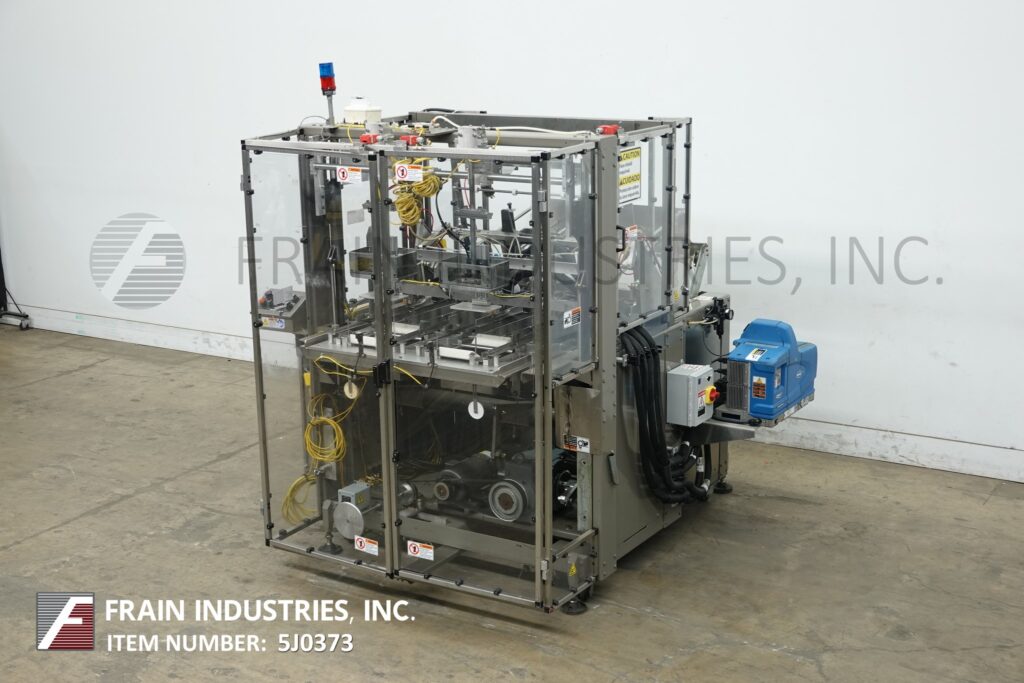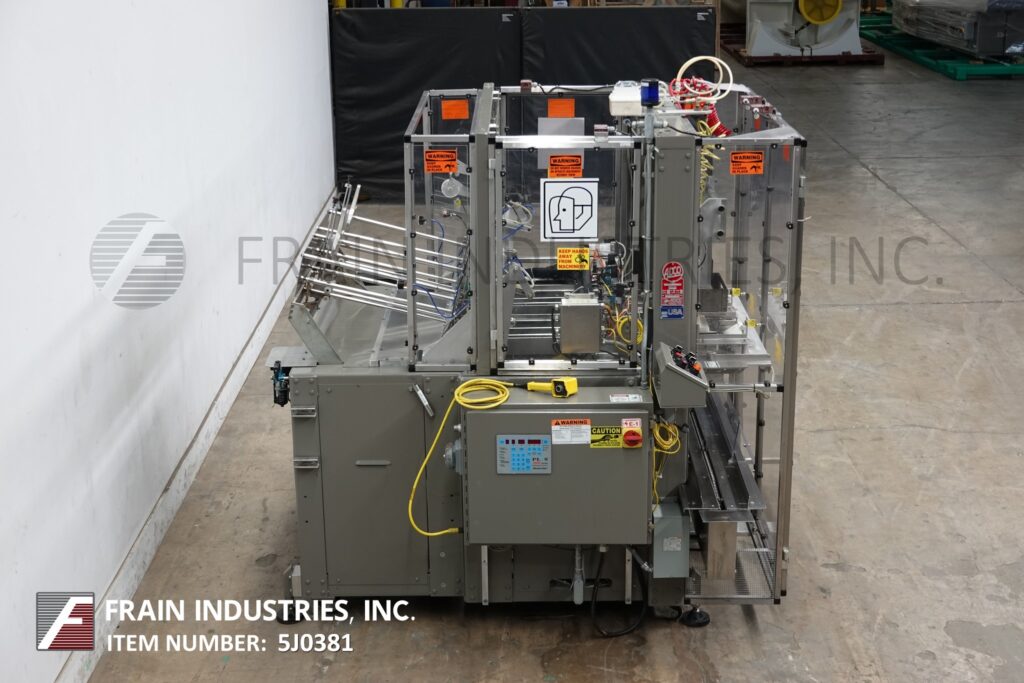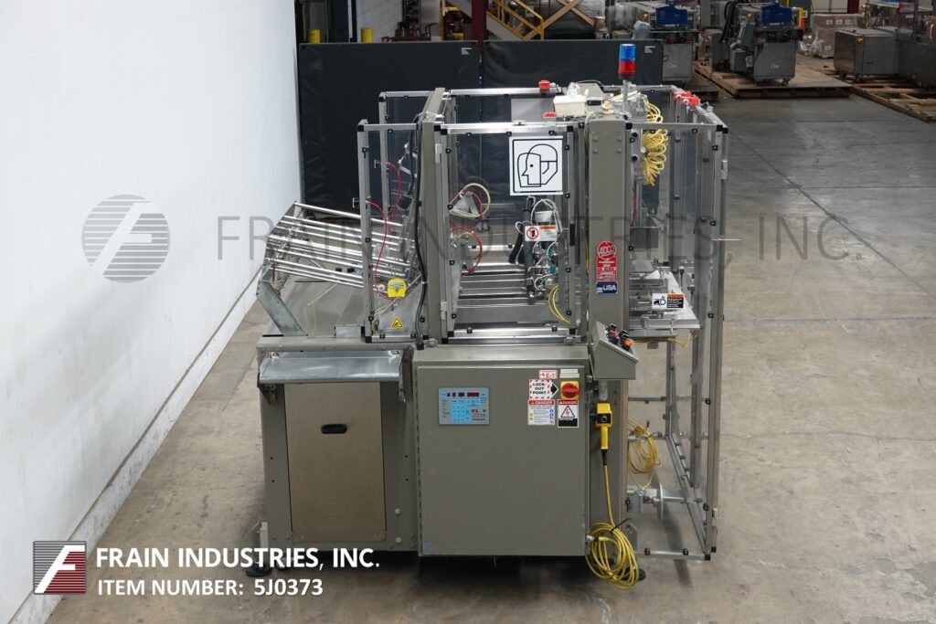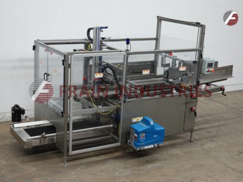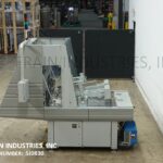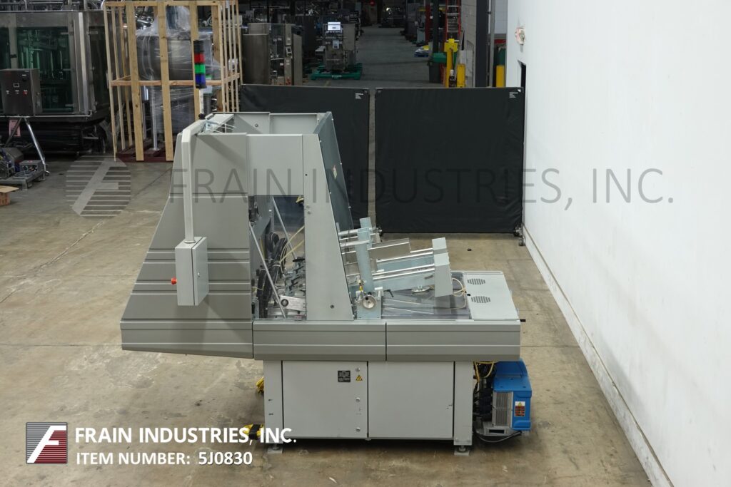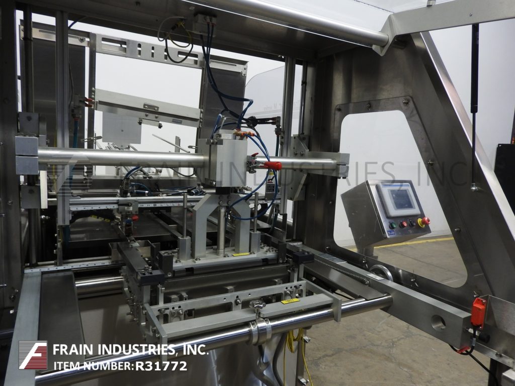 MGS, Model TLC, automatic, intermittent, top load auto cartoner and packer with hot melt glue sealer. Rated up to 40 CPM – depending on materials and application. Tray size range: 2" to 9" in Length; 1¾" to 6" in Width; 2" to 8" in Height. Equipped with 32" long blank tray magazine, (2) 6 suction cup vacuum blank pic n place, single tray forming head, Nordson hot glue melt system, 156" long (2) chain lugged tray conveyor set on 12" centers running through glue systems, (4) 4¼" Long x 1¼" wide x ½" deep 6 pocket shuffle bucket indexing on 68" dual belt conveyor, quick change tooling. Single head, 2 Axis robotic product pick n place, leaflet feeder. Control panel has AB PLC with touchscreen HMI. Mounted on leveling legs with kleen top design safety guarding.