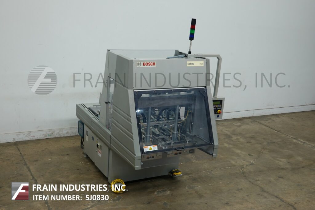 Bosch, Model 7520, Automatic, dual head, hot melt glue tray former. Rated from 30 to 70 cycles per minute – depending on materials, application and machine configuration. Carton size range: Flat blank 5" to 45.6" in Width and 5" to 35" in Length. Formed carton: 3" to 17" in Width, 4" to 20" in Length and 1" to 6" in depth. Equipped with (2) 22" long blank tray magazines, dual head formers and Nordson hot melt glue system. Control panel has AB controller and touch screen HMI.