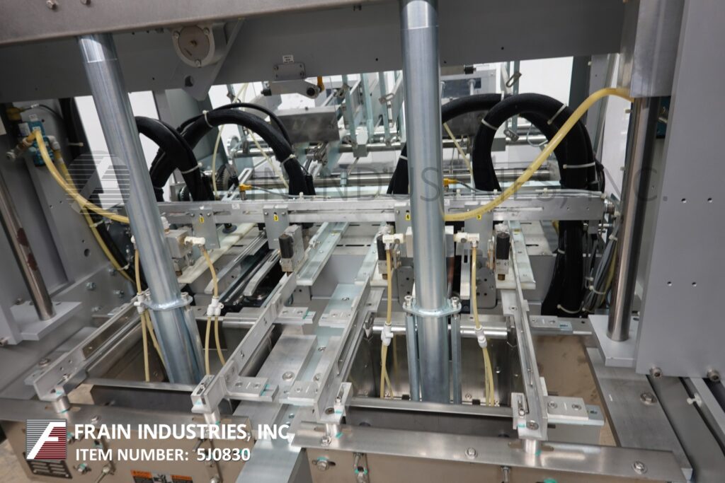 Delkor, Model Trayfecta S4 1502, Automatic, dual head, top load, tray former and hot melt glue sealer. Rated up to 80 trays per minute – depending on materials and application. Blank size range: 5" to 25" in length, 7¼" to 22¼" in width. Formed size range: 3" to 14¼" in length, 3" to 20¼" in width, 1" to 7" in height. Equipped with dual blank tray magazine has dual vacuum suction cup recipicating pick-in-place and dual mechanical tray forming heads, with no tray / no form photo eyes and Nordson hot melt glue system. Control panel has A/B PLC controller with touch screen HMI. Mounted on heavy duty height adjustable frame and safety guarding,