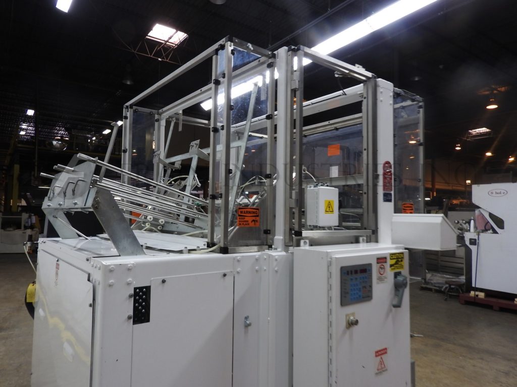 Bosch Model 7520, automatic, dual head, hot melt glue tray former with number of trays per minute – depending on materials, application and machine configuration. Tray size range: flat blank up to 22" in Width; up to 30" in Length. Equipped with dual 32" long blank tray magazine, dual vacuum suction cup reciprocating pick-in-place, dual shuttle flat tray indexing systems with pusher lugs and dual mechanical tray forming heads. No tray / no form photo eyes and Nordson hot melt glue system. Swing arm touch pad controller with display and status light bar. Mounted on heavy duty frame with leveling legs.