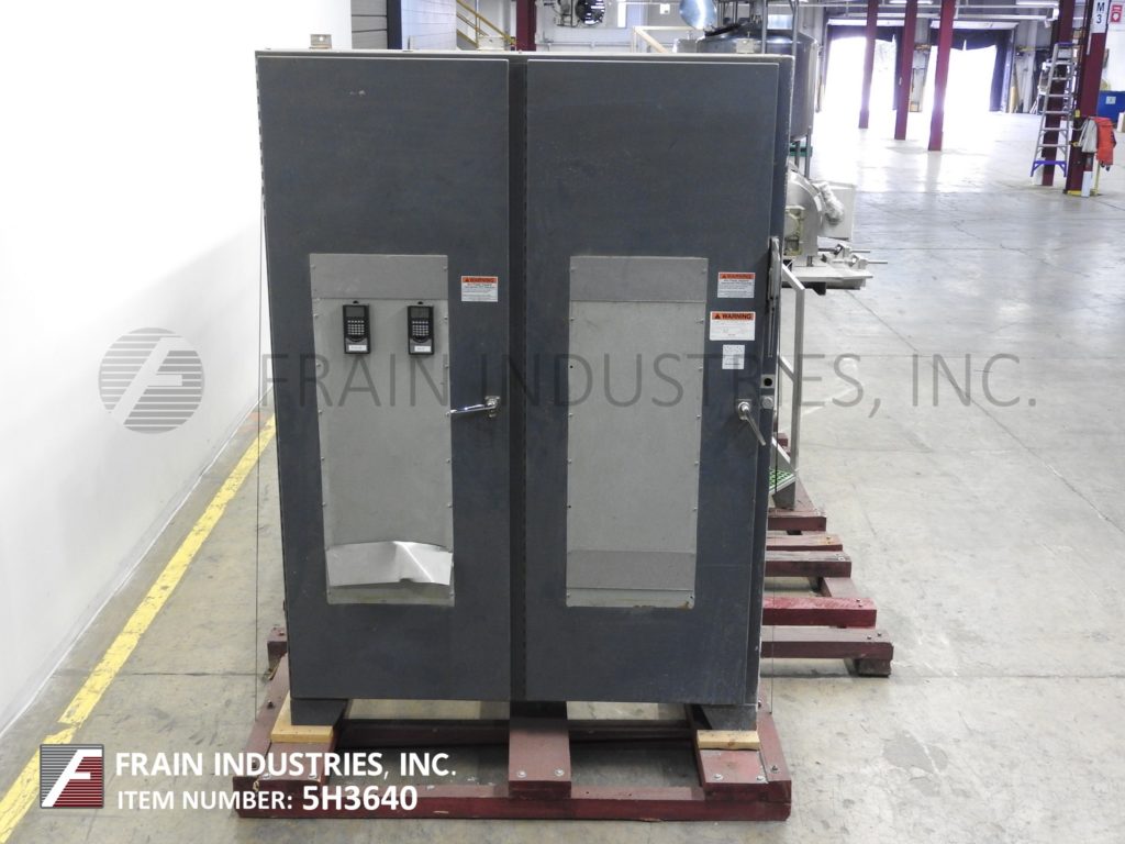 GEA Westfalia Model CC 450-01-32, Solid bowl, 3000 rpm, clarifying and drying decanter style centrifuge rated up to 250 gallons per minute – depending on materials, application and machine configuration. All stainless steel sanitary wetted parts. Solid bowl decanter centrifuge with solids G/CC of 2.0 Maximum and bowl speed of 3000 rpm, welded hard facing with flip up cover and lined solids discharge ports, liquid plate dams, 30 Hp main and 11 Hp secondary motor drives. Remote control panel has A/B Powerflex vari speed controllers. Mounted on heavy duty (4) leg frame.