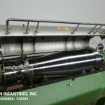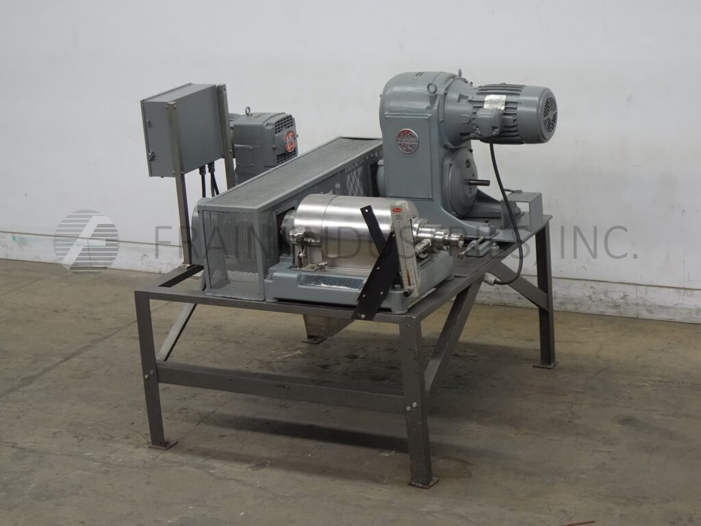 Alfa Laval Model NX20731S60HZ, Horizontal, solid bowl, decanter centrifuge rated up to 60 gallons per hour – depending on materials, application and machine configuration. All stainless steel sanitary wetted parts, 6" Diameter x 12" long bowl, pitched inner product scroll with flip up bolt down cover, 2-1/4" OD, 2" threaded ID front product feed port, 4900 rpm bowl speed, 7.5 Hp v-belt main drive, and 2 Hp variable speed back drive both with safety guarding and control panel with start and stop push button controls. Mounted on 54" long x 60" wide x 30" high (4) leg frame.