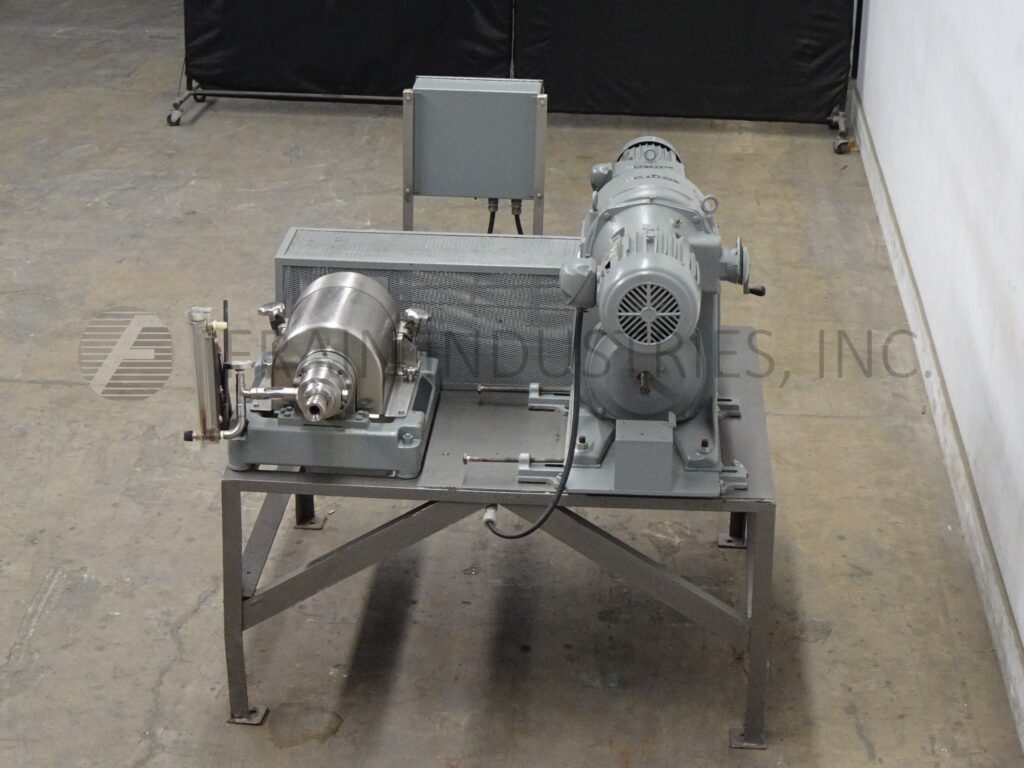 Alfa Laval Model MAB 103B24 continuous, solid retaining (3) separator centrifuge, capable of doing up to 1150 liters or 300 gallons per hour of product per hour – depending on materials and application. Capable of seperating out solids, liquids and sediments and has 1 Hp motor drive. Mounted on a painted base frame with control box.