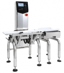 A Checkweigher is a machine that checks the weight of a package, product, or carton that travels across the load cell of the machine. Checkweighers are outfitted with different kinds of product reject devices to prevent underweight and overweight packages from proceeding down line. Checkweighers determine overweight and underweight based on parameter inputs. Checkweighers are also used to automatically space filled packages, weight them to check the accuracy of the gross weight, segregate the underweight packages, produce feed-back information for controlling the filling operation and perform a number of other control and record keeping operations. As a general rule, the length of the load cell or weigh cell on the checkweigher should be approximately 1.5 times the length of the package to be weighed. (Technically speaking, the package need only be on the load cell by itself for a fraction of a second, so that a checkweigher with a smaller load cell is suitable for a slower moving line.) Different types of checkweighers are designed for different types of products. Some checkweighers can accurately weigh small tablets in a pharmaceutical house and others may weigh large items that weigh several pounds.