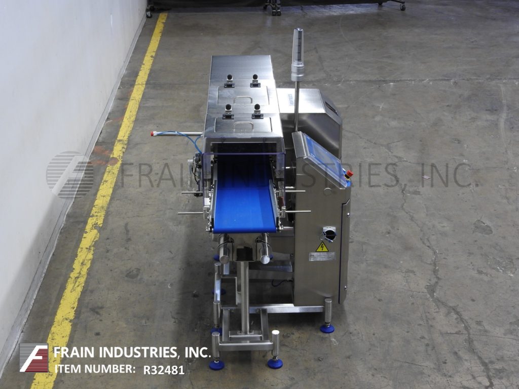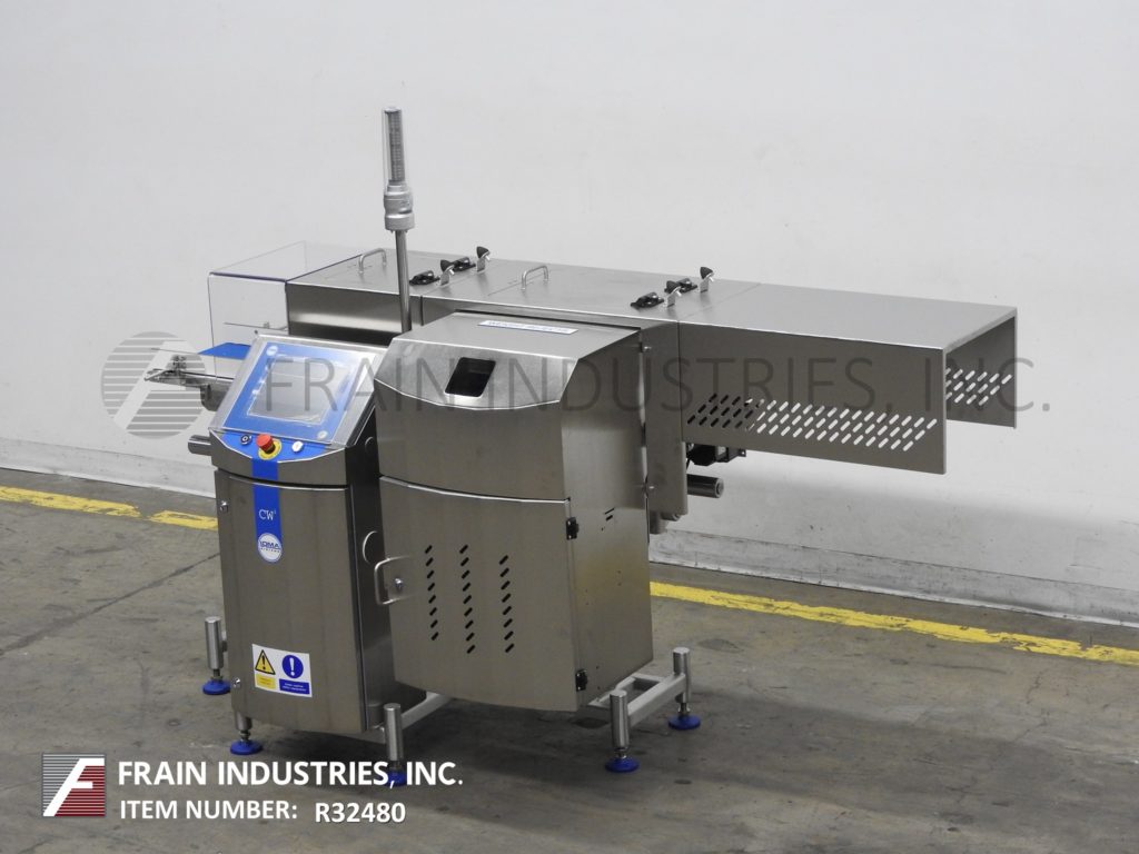 Loma Model CW3 1500, inline, checkweigher rated up to 140 feet per minute with number of product – depending on materials, application, machine configuration and environment being run in. 304 stainless steel construction with brushed finish, Weight range: 10 to 1500 grams. with Accuracies down to 0.18 gram depending on product being run and enviroment being run in, IP65 enviroment and temperatures from 0 to 40 Deg C. Equipped with 22" long x 11-3/4" wide in feed, 15.75" long x 11-3/4" wide load cell and 27" long x 11-3/4" wide discharge anti static food quality conveyors with single ram arm reject, reject collection bin and statis light bar. Control panel has touch pad controller with readout, start, stop, e-stop push buttons and data retrieval capable. Mounted on height adjustable (4) leg base frame.