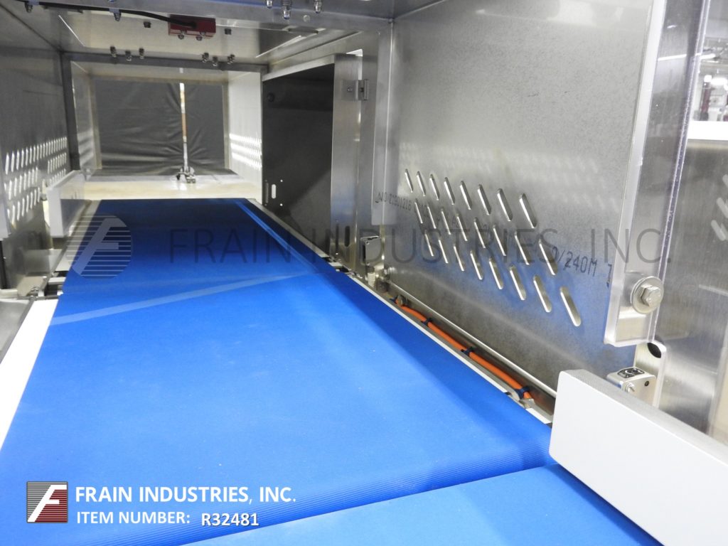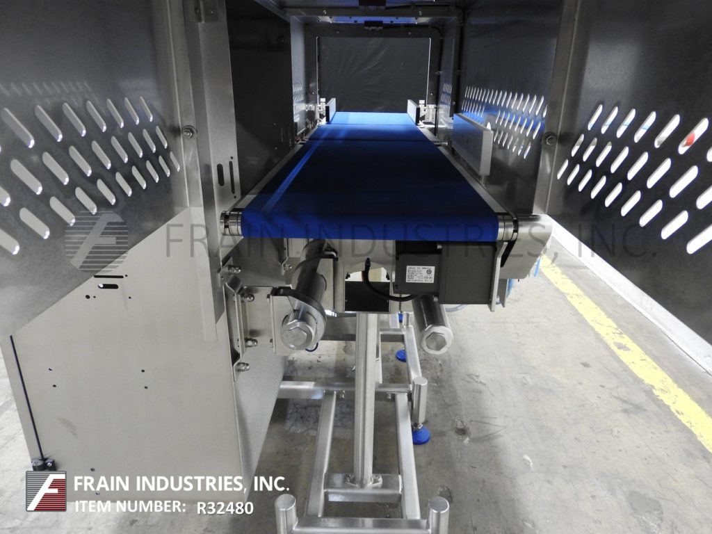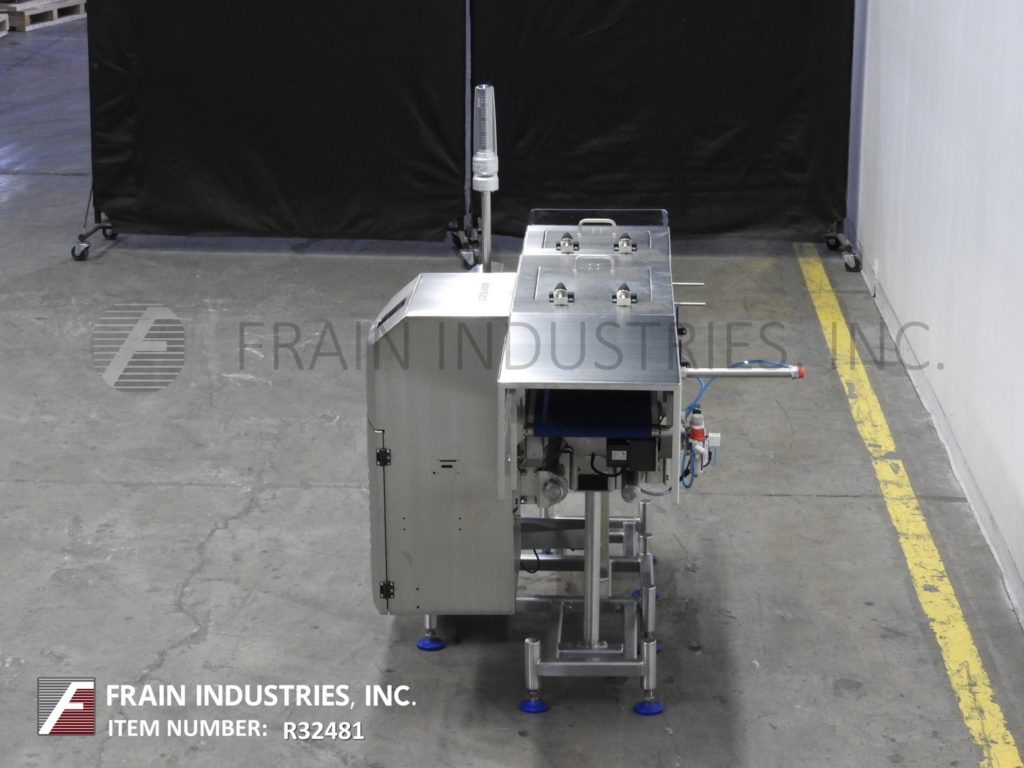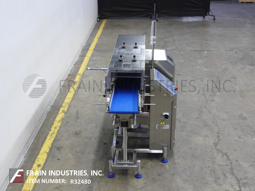 Ishida, Model DACS-GN-S015-SS-1, automatic, (3) zone, 304 stainless steel checkweigher. Rated up to 300 feet per minute with number of product – depending on materials and application. Load cell: 14" in Length; 9.5" in Width. Weight range: 6 to 1,500 grams with Accuracy: +/- 0.1 grams with accuracies dependant on materials, application, machine configuration and environment being run in. Equipped with 13.8" long x 9.5" wide neoprene in feed conveyor, stainless steel guide rails, 13.8" long x 9.5" wide neoprene weighing conveyor, 17.7" long x 9.5" wide neoprene discharge conveyor with dual air blast rejects ( one over / one under). Control panel with touch pad operator interface has 7" full color LCD display with 300 "preset" product programs, SUSB memory stick with X-bar charts and histogram and RS232 serial output of raw weight data. Mounted on (4) height adjustable legs.