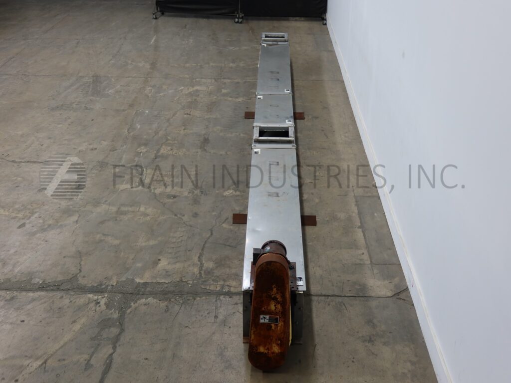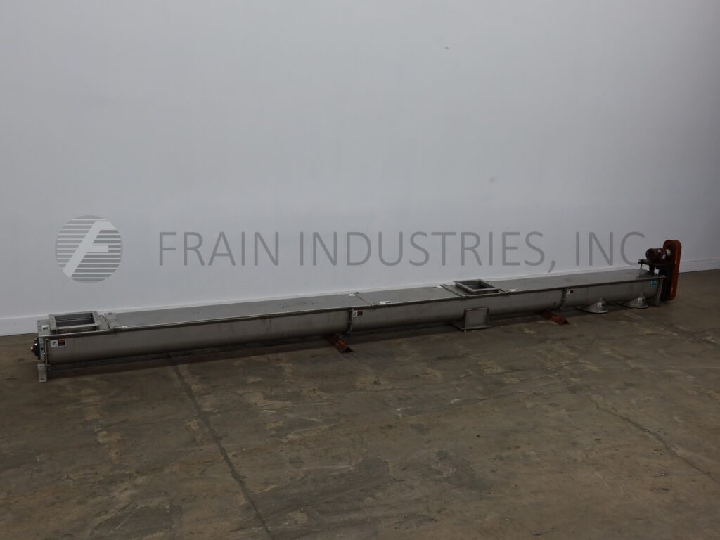 Thomas Conveyor Company, 308" long x 12" diameter, stainless steel, screw feeder. Equipped with (2) 17" x 17" flanged top infeeds, 3 hp drive, (1) 17" x 17" flanged discharge and (2) 17" diameter flanged discharges.