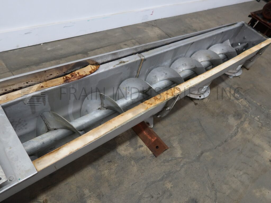 American Process Systems, 9" diameter x 65" long, stainless steel screw conveyor. Equipped with a 9" diameter screw on a 3" diameter shaft with 5" centers on infeed and 9" centers on discharge, 22" x 17" inlet and a 12" x 12" discharge.