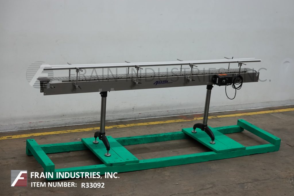 Accutek, 4½" wide x 120" long, stainless steel table top conveyor. Equipped with a 4½" wide x 120" long stainless steel belt with and infeed / discharge height range of 32" to 36" and mounted on a (4) leg frame with variable speed control.